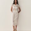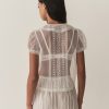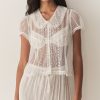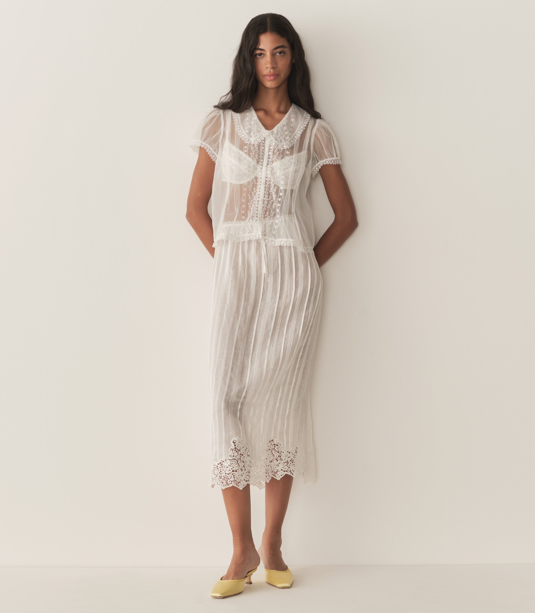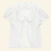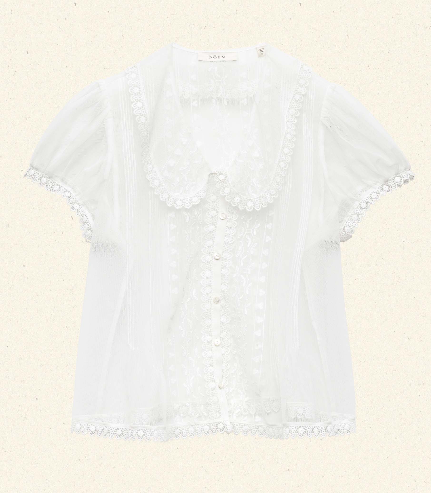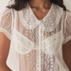 In a sheer tulle, the Angella Top features a Peter Pan collar and short puffed sleeves. Intricate Victorian-inspired embroidery and floral lace insets adorn the collar and slightly cropped bodice, and clustered pintucks lend texture. Mother-of-pearl buttons extend down the front, and the collar, sleeve cuffs, and hem are trimmed with petite lace ruffles.