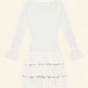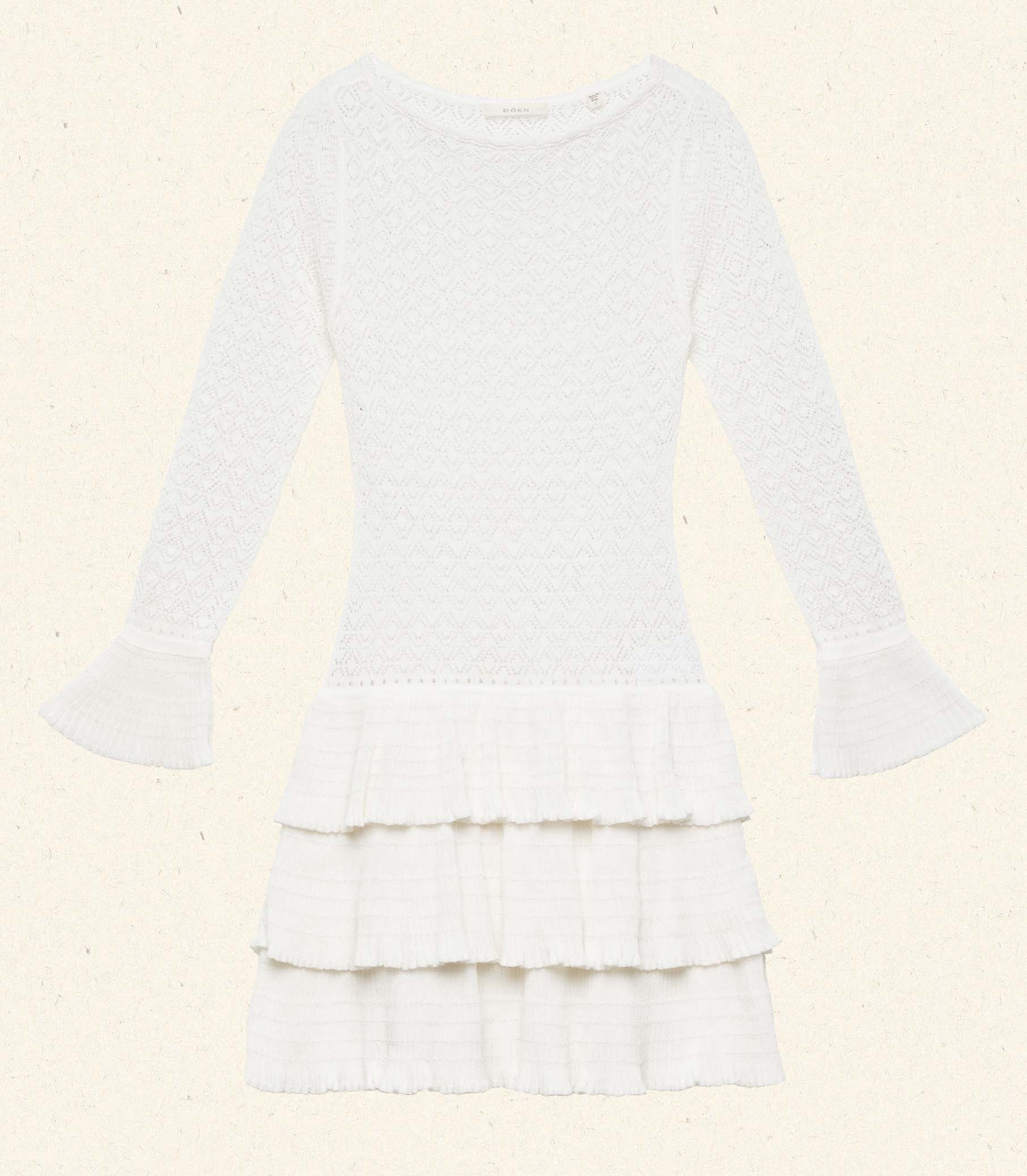 In a lightweight, slightly sheer viscose blend, the ‘60s-inspired Amelina Dress features a bateau neckline, bracelet-length sleeves, and a tiered mini skirt. The fitted bodice and sleeves are detailed with a delicate allover pointelle design, and ruffles finish the sleeve cuffs.nnMade with Lenzing™ ECOVERO™, which comes from sustainably-managed forests and has lower water and emissions impacts than traditional viscose.