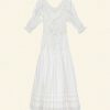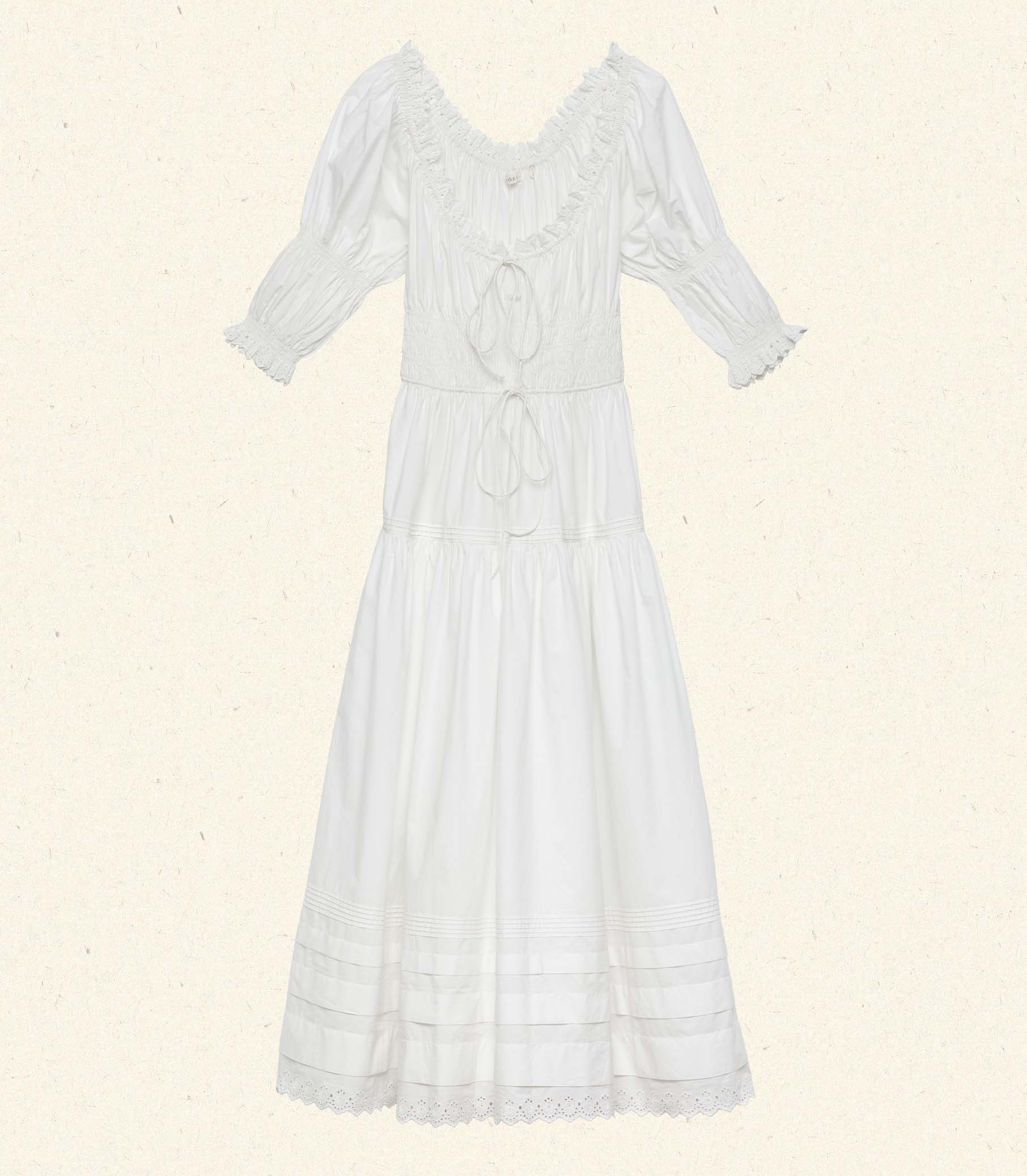 In a crisp organic cotton, our Bardot Dress combines details from two of our favorite styles, the Ischia Dress and Sebastiane Skirt. It features double-puffed sleeves, a scoop neckline adorned with petite ruffles and a functional center tie, while a smocked bodice gives way to an ankle-grazing A-line skirt—thoughtfully graced with horizontal pintucks and trimmed with scallop eyelet embroidery.