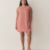 Crafted from a lightweight rayon-linen blend and rendered in our nostalgic Marilyn Gingham, the Coralie is a ‘60s-inspired sleeveless shift dress with a crew neckline, a straight cut, and a playful mini hemline. Shell buttons fasten at the side seam and shoulder.