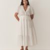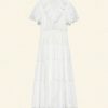 Crafted from a vintage-inspired cotton-voile dobby, the Gabriella Dress features subtly gathered flutter sleeves and a plunging V-neckline framed with cascading lace-trimmed ruffles. Intricate embroidered floral lace trims the neckline and sleeve cuffs, while the bodice and tiered ankle-grazing skirt are embellished with inset floral lace patches.