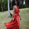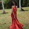 The ‘30s-inspired Lilaia Dress is a shimmering silk-satin treasure, featuring a high halter neck adorned with removable flower brooches, a low V-shaped back, and cut-out details at the bodice. A fitted waist with an invisible side zipper gives way to an ankle-grazing, bias-cut skirt.