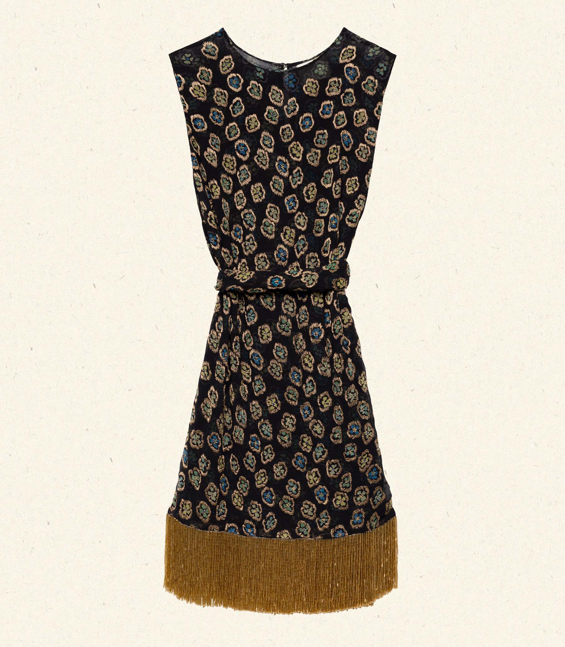 Crafted from silk crinkle chiffon, the DÔEN Heirloom Liza Dress is an extra-special keepsake and favorite of our co-founders, Margaret and Katherine. With a playful shift silhouette, this treasure is graced with our Joni Floral, and each floral motif is finished with intricate gold lamé embroidery. The mini hemline is trimmed with hand-beaded fringe, and the matching belt can be tied to cinch the waist, or it can be worn as a scarf. A single self-covered button with a keyhole detail fastens at the back of the neck.