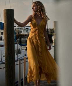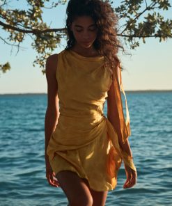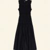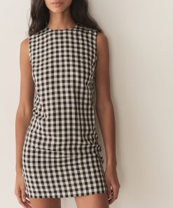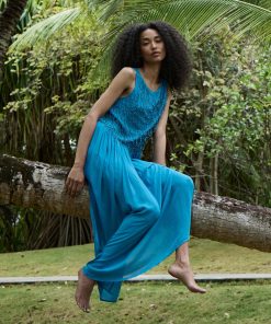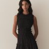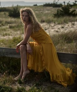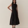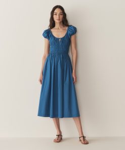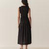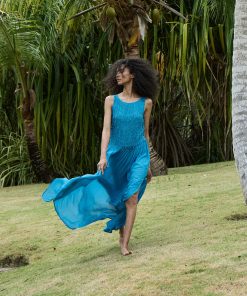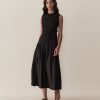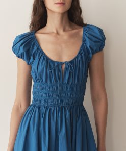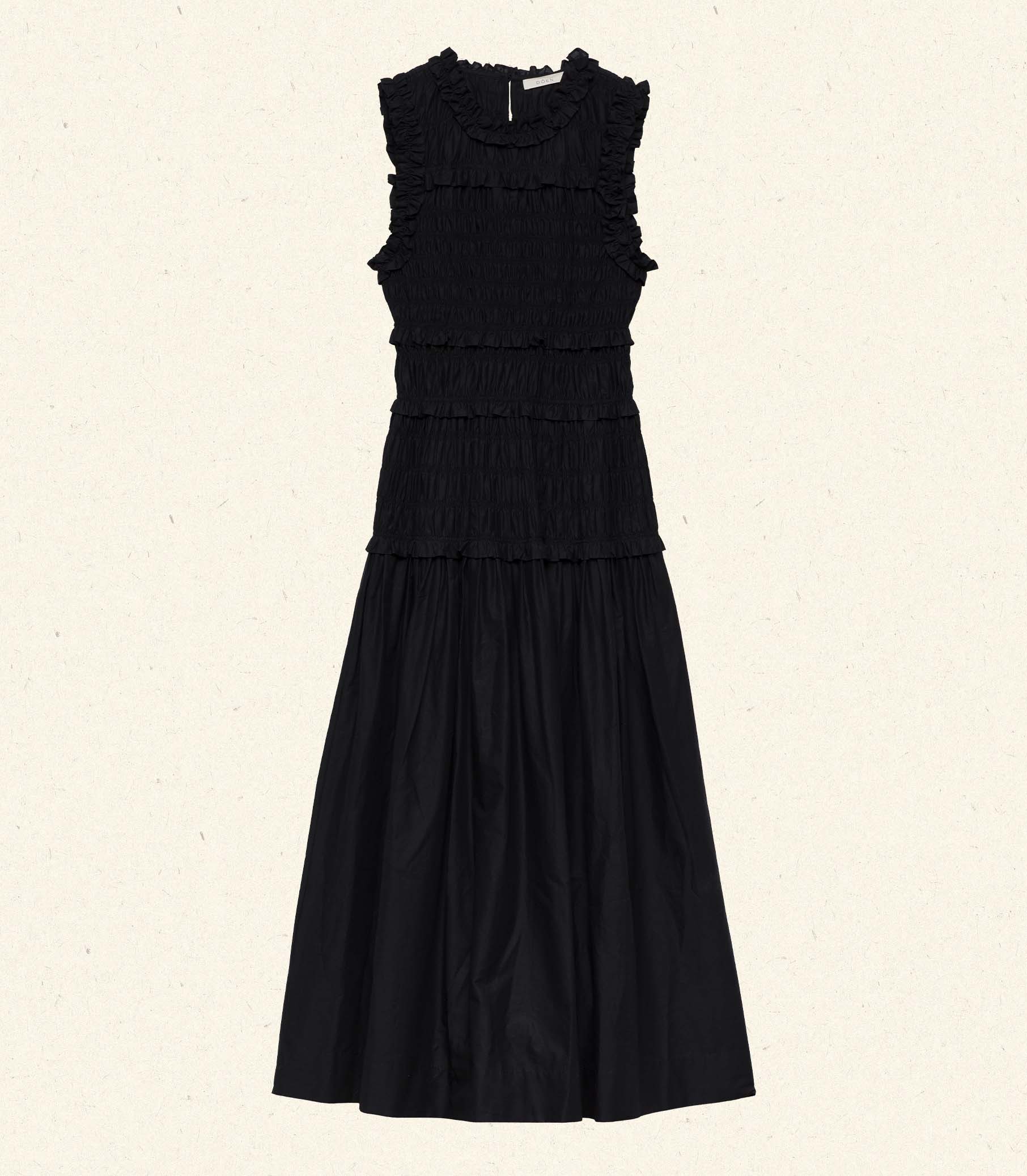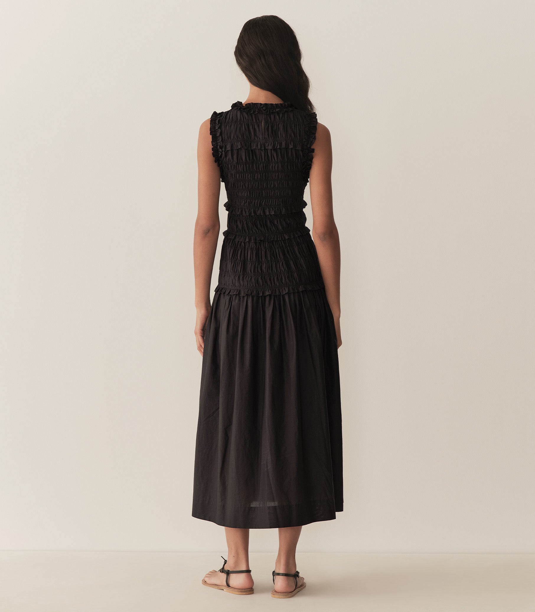 Crafted from crisp 100% organic cotton poplin, the Mallory Dress is a sleeveless style with a high neck, a gathered bust, and a fitted bodice framed with petite ruffles. A third gathered panel finishes just below the hips, flaring out into an ankle-grazing A-line skirt.