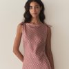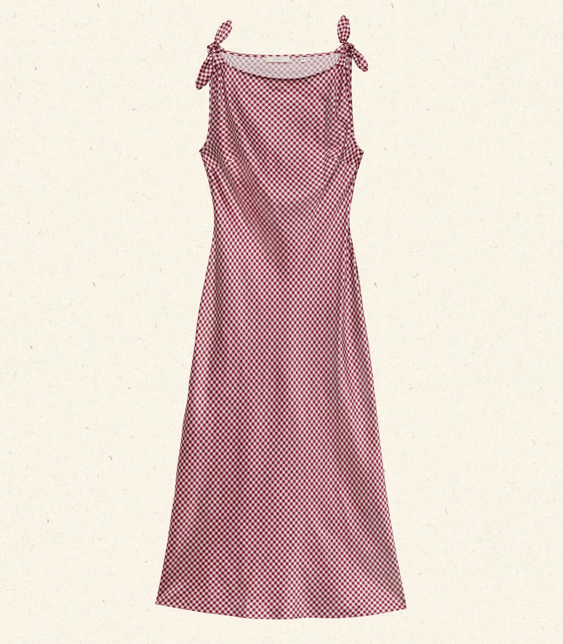 In a textured silk-blend seersucker adorned with our ‘50s-inspired Valencia Gingham, the Mariselle Dress is a sleeveless midi-length dress with a bateau neckline and adjustable shoulder ties. A bias-cut silhouette falls to mid-calf.