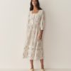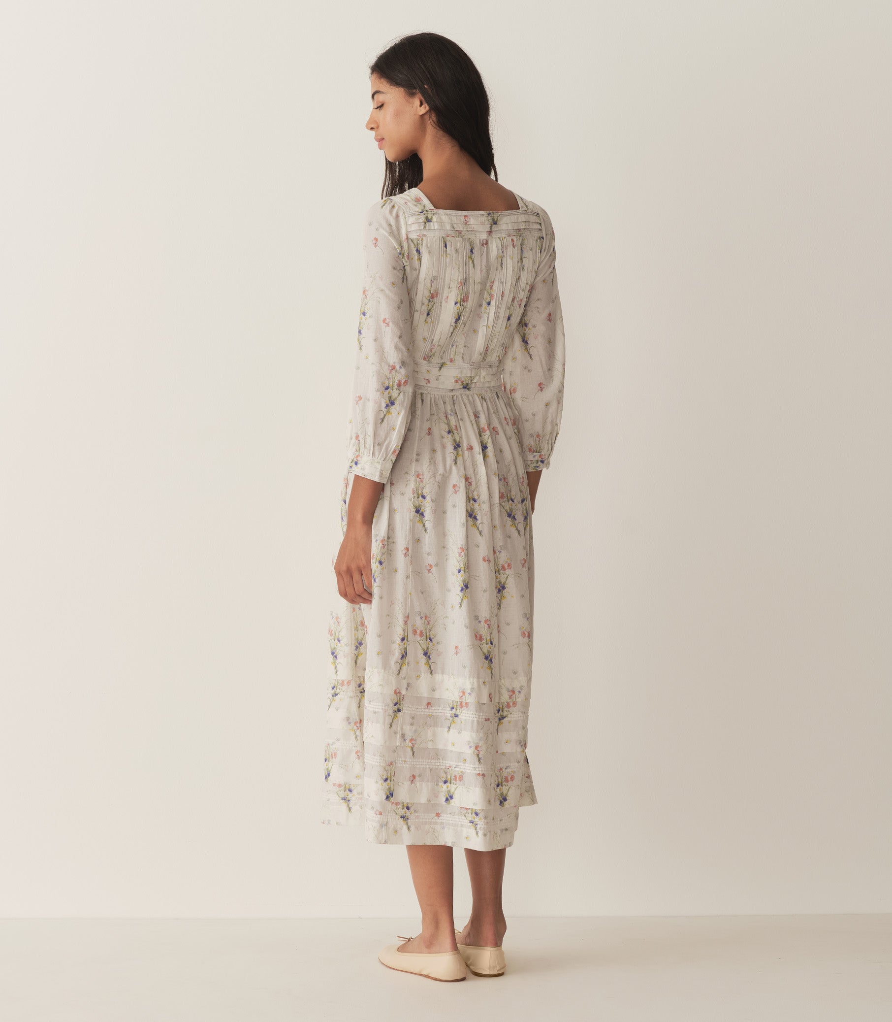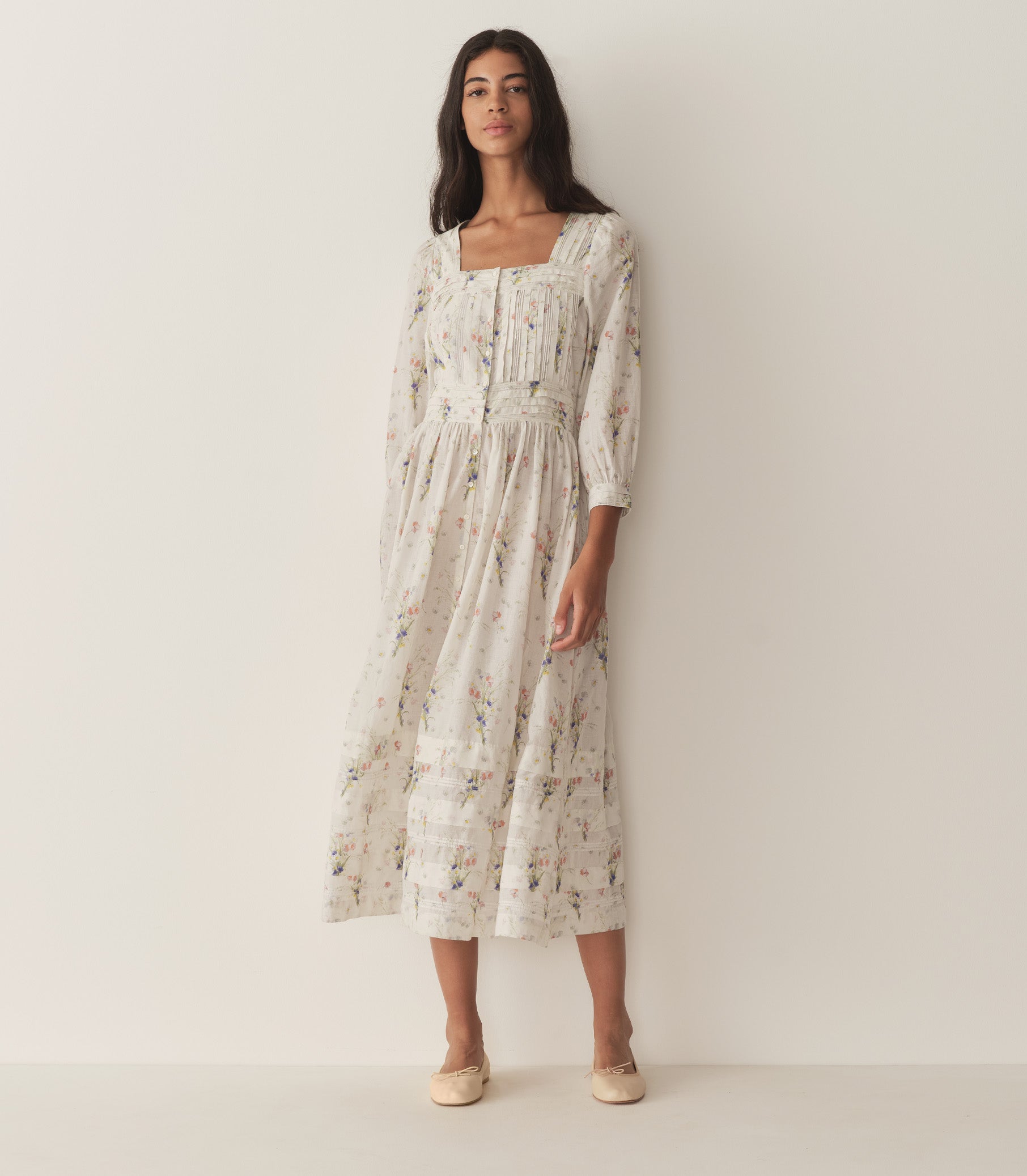 In a soft, lightweight organic cotton voile, the Minta Dress features a breezy silhouette, square neckline, and bracelet-length sleeves finished with single button cuffs. Panels of wide pintucks frame the neckline and structure the waist, giving shape to the bodice and button-down front.