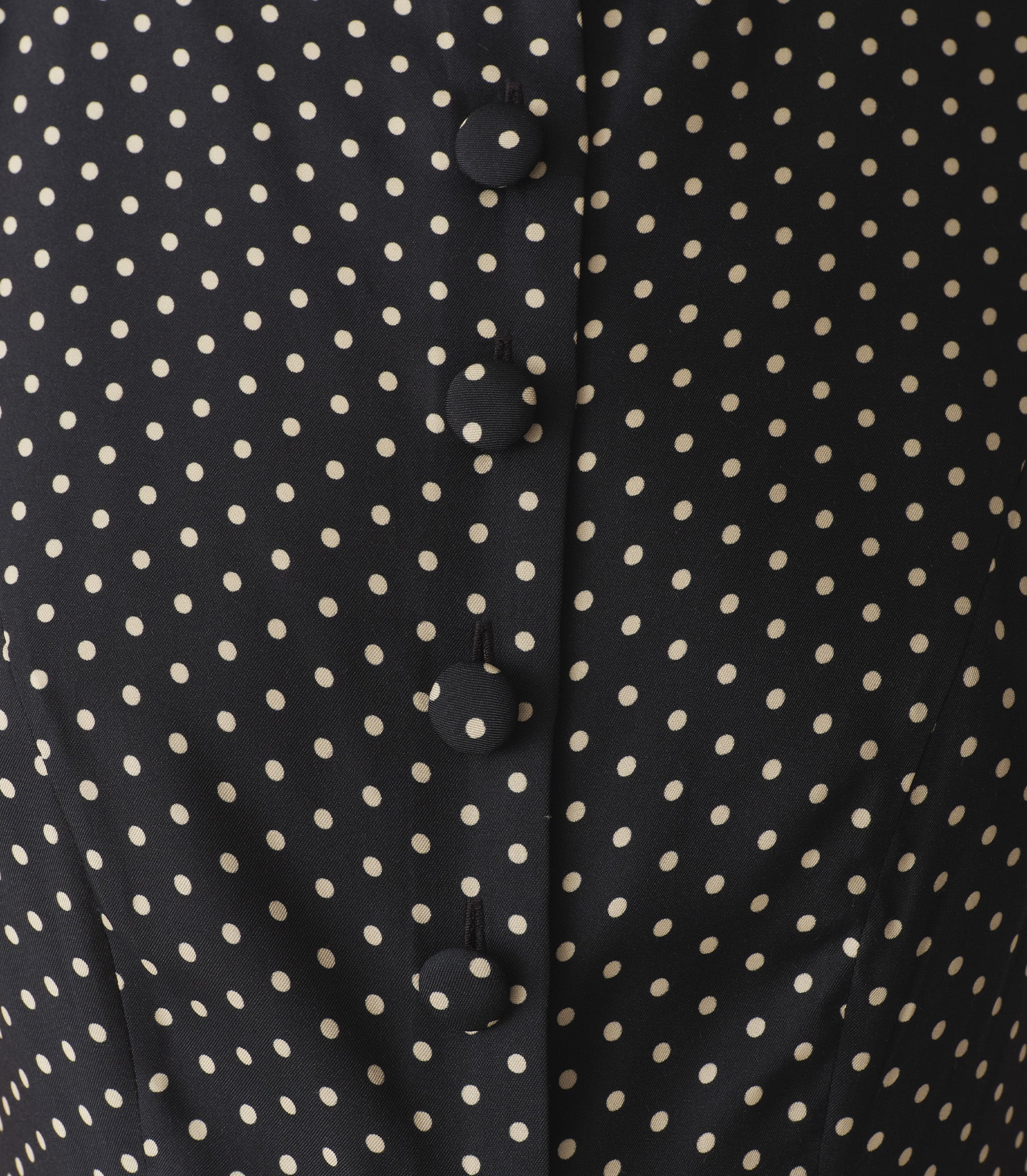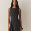 nTaking cues from our best-selling Aubrey Dress, the silk-viscose twill Monette Dress is a sleeveless style with a bateau neckline and swingy mini hemline, adorned with our playful navy-and-white Hepburn Dot. Princess seams lend structure to the bodice, while a back waist tie allows you to adjust the fit. Self-covered buttons extend down the front.