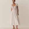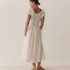 We’ve reimagined our forever-favorite Quinn Dress in a lightweight organic cotton voile with allover eyelet embroidery. The Quinn features a scoop neckline with an adjustable tie and playful keyhole detail, a gathered bust, and short puffed sleeves. A fitted bodice with elasticized smocking gives way to a fully lined, midi-length skirt.