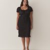 In a lightweight ramie, the Rosalynn Dress features short puffed sleeves, a scoop neckline, and allover smocking at the bodice and skirt, with functional ties at the neckline and waist. A fitted silhouette gives way to a skirt that finishes just below the knee, and petite ruffles adorn the sleeve cuffs and hem for a touch of vintage charm.