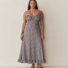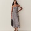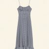 nIn a swingy silk-viscose twill and rendered in our nostalgic navy Santa Marina Gingham, the Rosaria Dress features a square neckline, ultra-skinny spaghetti straps, and a ruched bust. A fitted waist with an invisible side zipper gives way to an ankle-grazing A-line skirt with a ruffle trim.