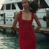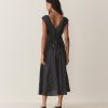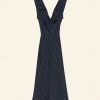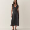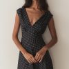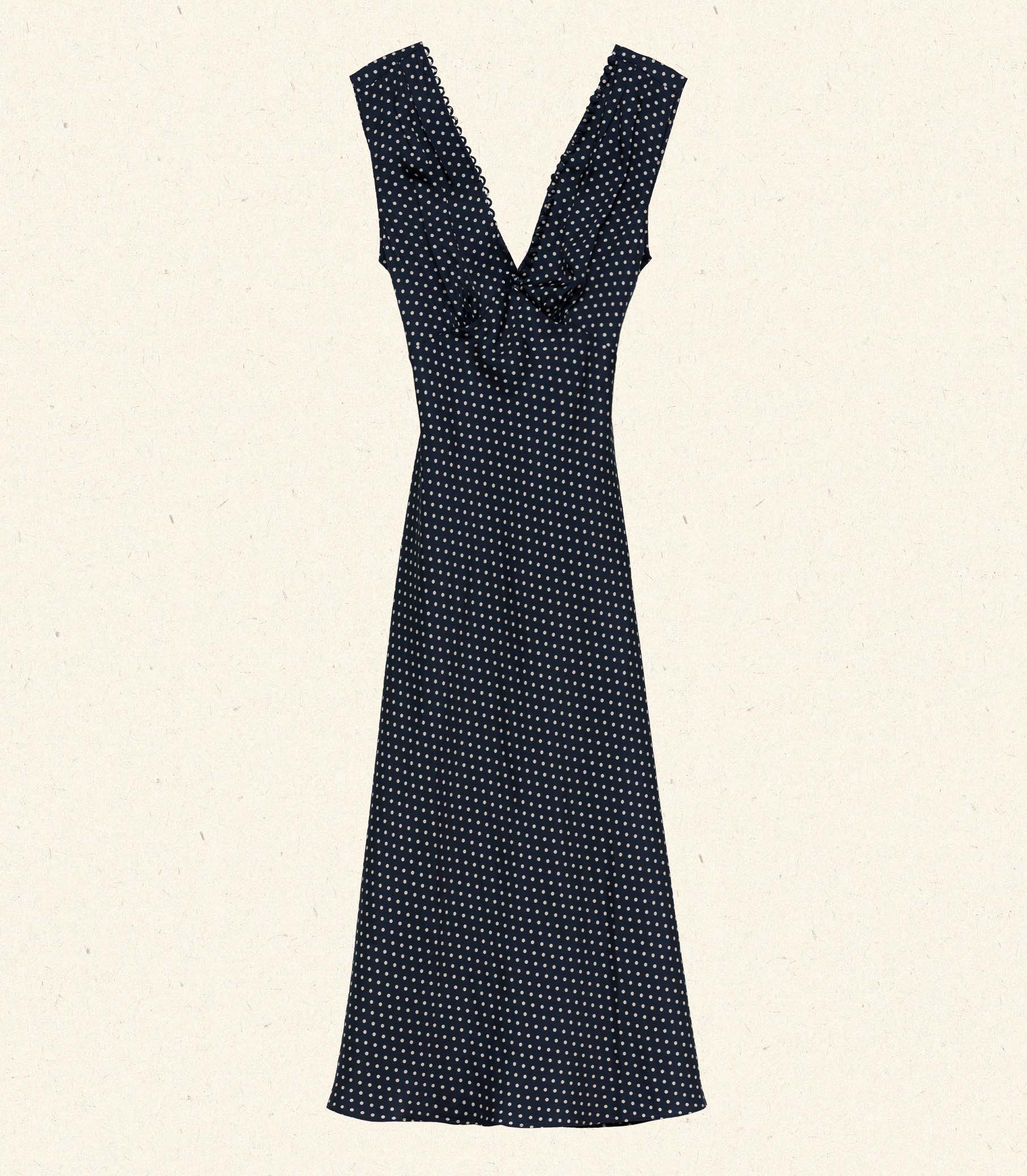 nIn a buttery silk-viscose twill and adorned with our playful navy-and-white Hepburn Dot, the ‘30s-inspired Tahlia Dress—a favorite of our co-founder Katherine—features a plunging V-neckline trimmed with decorative self-covered buttons. A fitted bodice with an adjustable back waist tie gives way to an ankle-grazing bias-cut skirt.