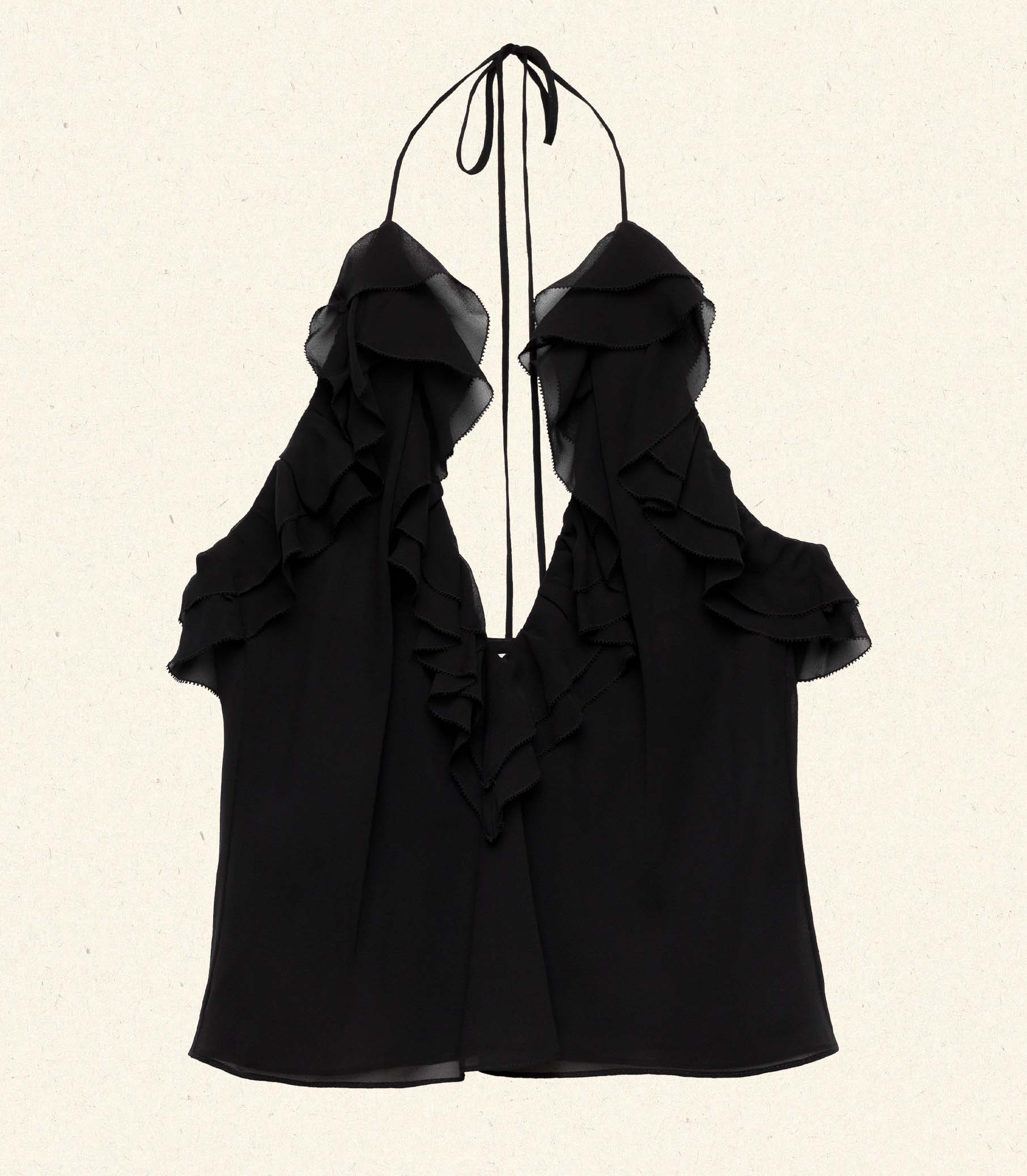Taking cues from the disco halter tops of the 1970s, the Emmelie Top is crafted from a floaty silk georgette lined with soft viscose, featuring a plunging V-neckline framed with cascading ruffles and a self-tie halter strap. Pair with the Elisa Skirt for a matching set.