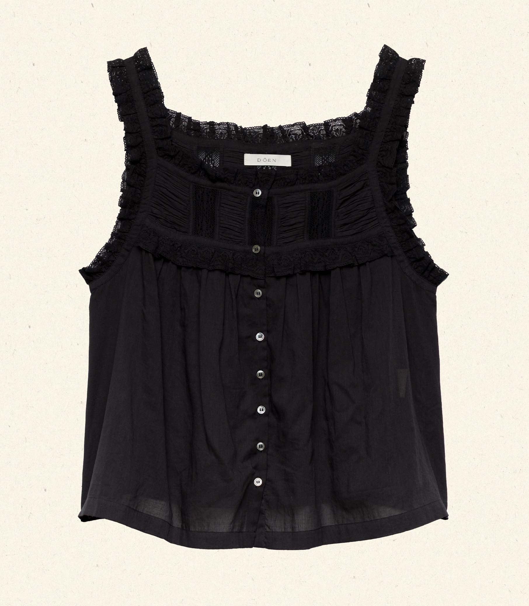 Taking cues from our beloved Frances Top—which we first designed in Spring 2019—the Fidella is a sleeveless top crafted from soft, lightweight organic cotton voile. The high square neckline is trimmed with ruffled lace, while a line of mother-of-pearl buttons extends down the center front. The yoke is adorned with alternating panels of ruching and inset lace. Leave it loose, or tuck it into your favorite pair of high-waisted jeans.