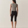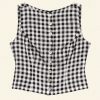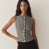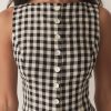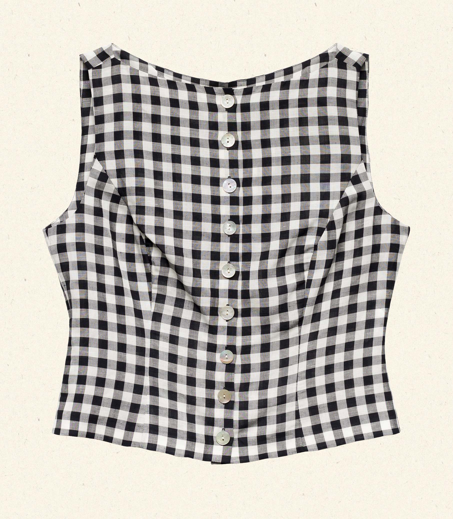 The ‘90s-inspired Hayden Top returns for Spring, tailored in a lightweight rayon-linen blend and rendered in our nostalgic Marilyn Gingham. The Hayden is a sleeveless style with a bateau neckline and a fitted silhouette. Shell buttons extend down the front, while princess seams lend structure to the bodice.