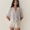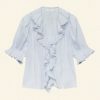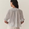 Crafted from the softest organic cotton voile, the Edwardian-inspired Henri Top—which made its debut in Spring 2018—is a Favorite Character we find ourselves returning to again and again. It features a plunging V-neckline framed with cascading lace-trimmed ruffles that extend down the bodice and delicate clustered pintucks at the yoke, back, and short puffed sleeves. A line of hidden starburst buttons run up the center front.