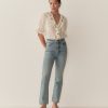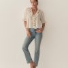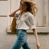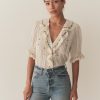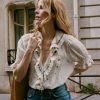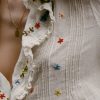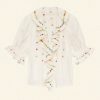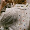 Crafted from the softest organic cotton voile, the Edwardian-inspired Hettie Top features a plunging V-neckline framed by a lace-trimmed ruffle that extends down the bodice. Colorful embroidered daisies and clustered pintucks lend texture to the yoke, back, and short puffed sleeves. A line of hidden starburst buttons extends down the center front. Wear it loose, or tuck it into your favorite high-waisted jeans.