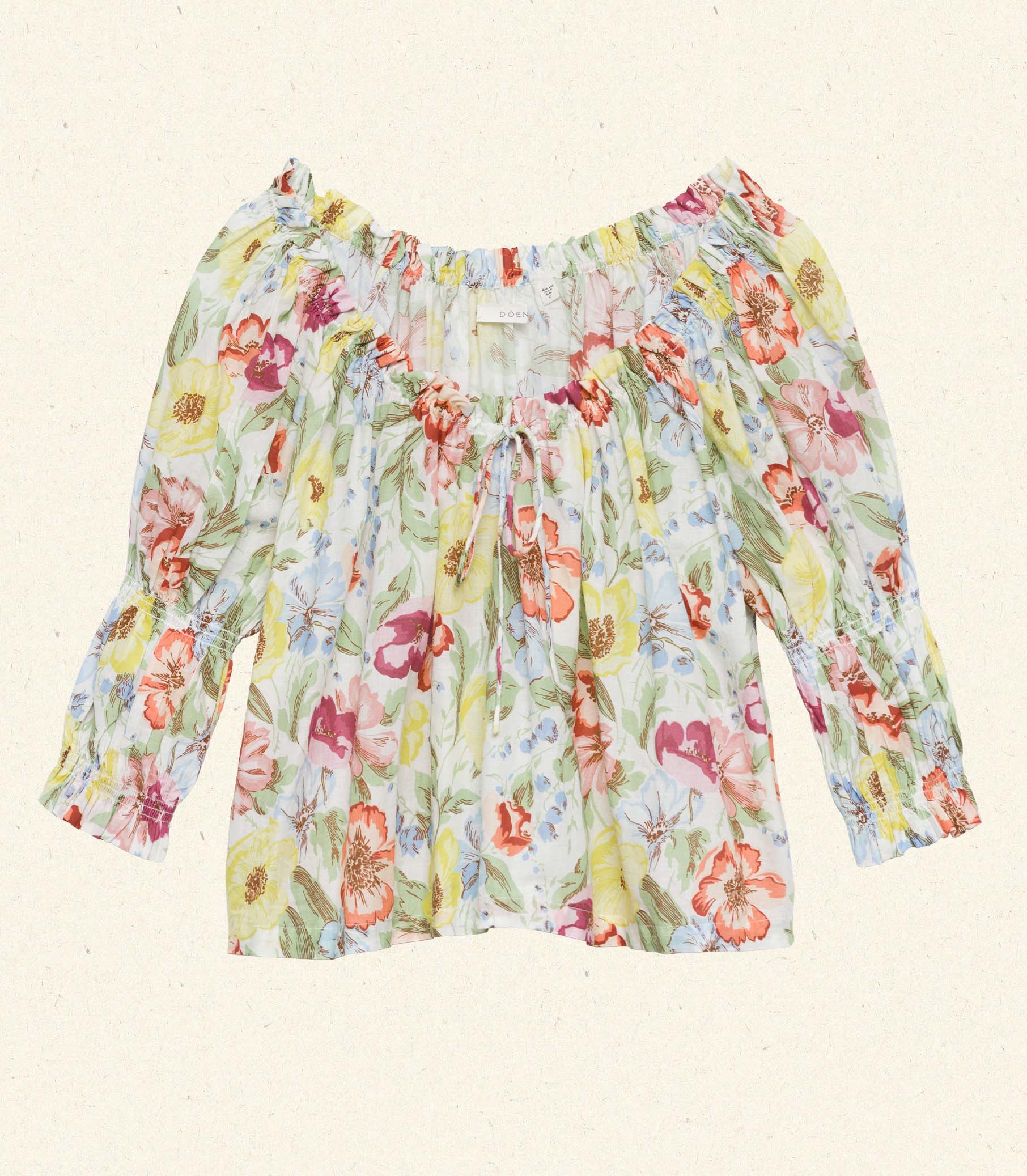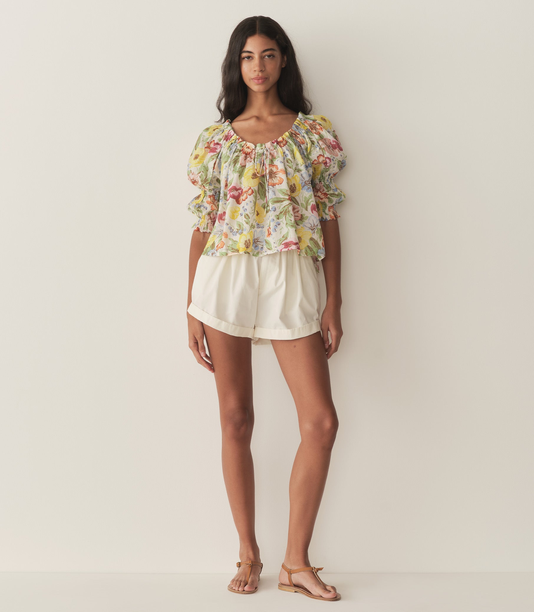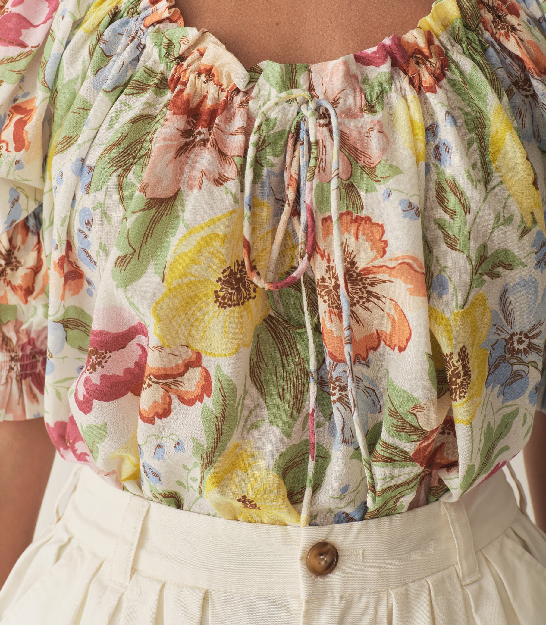 Crafted from the softest organic cotton voile and adorned with our colorful Anemone Bloom, the Inez Top debuts for Spring. Taking cues from our beloved Ischia Dress, the Inez features a breezy silhouette, double-puffed sleeves and a scoop neckline adorned with petite ruffles and a functional center tie.