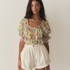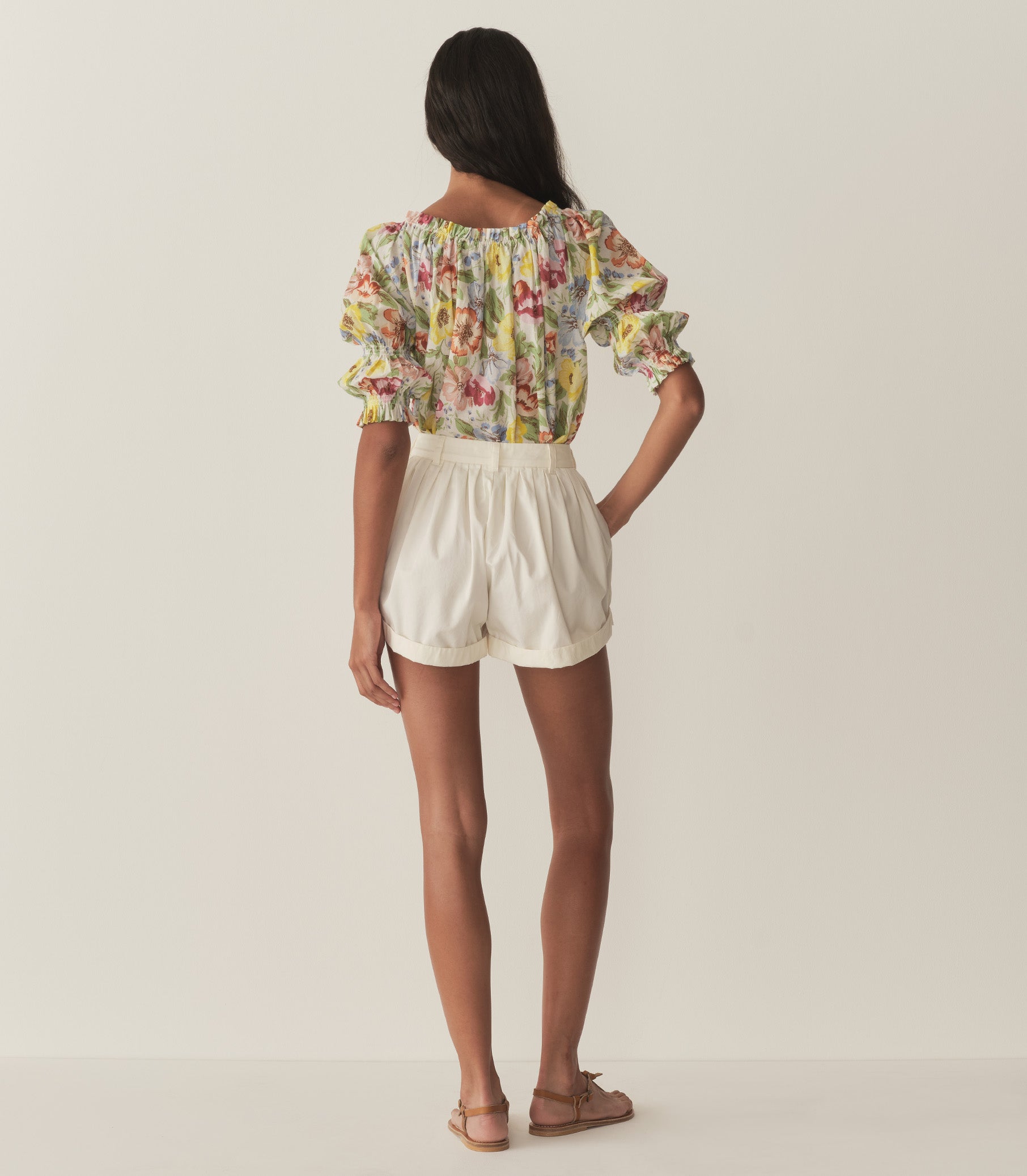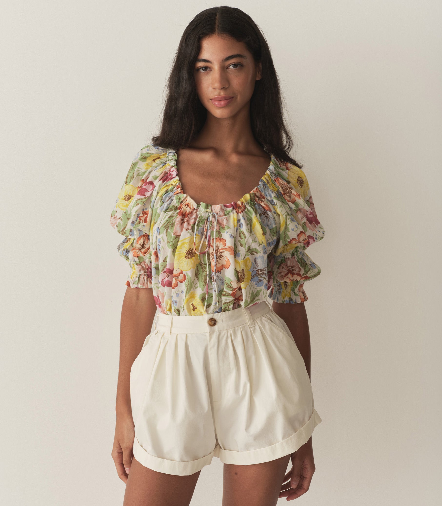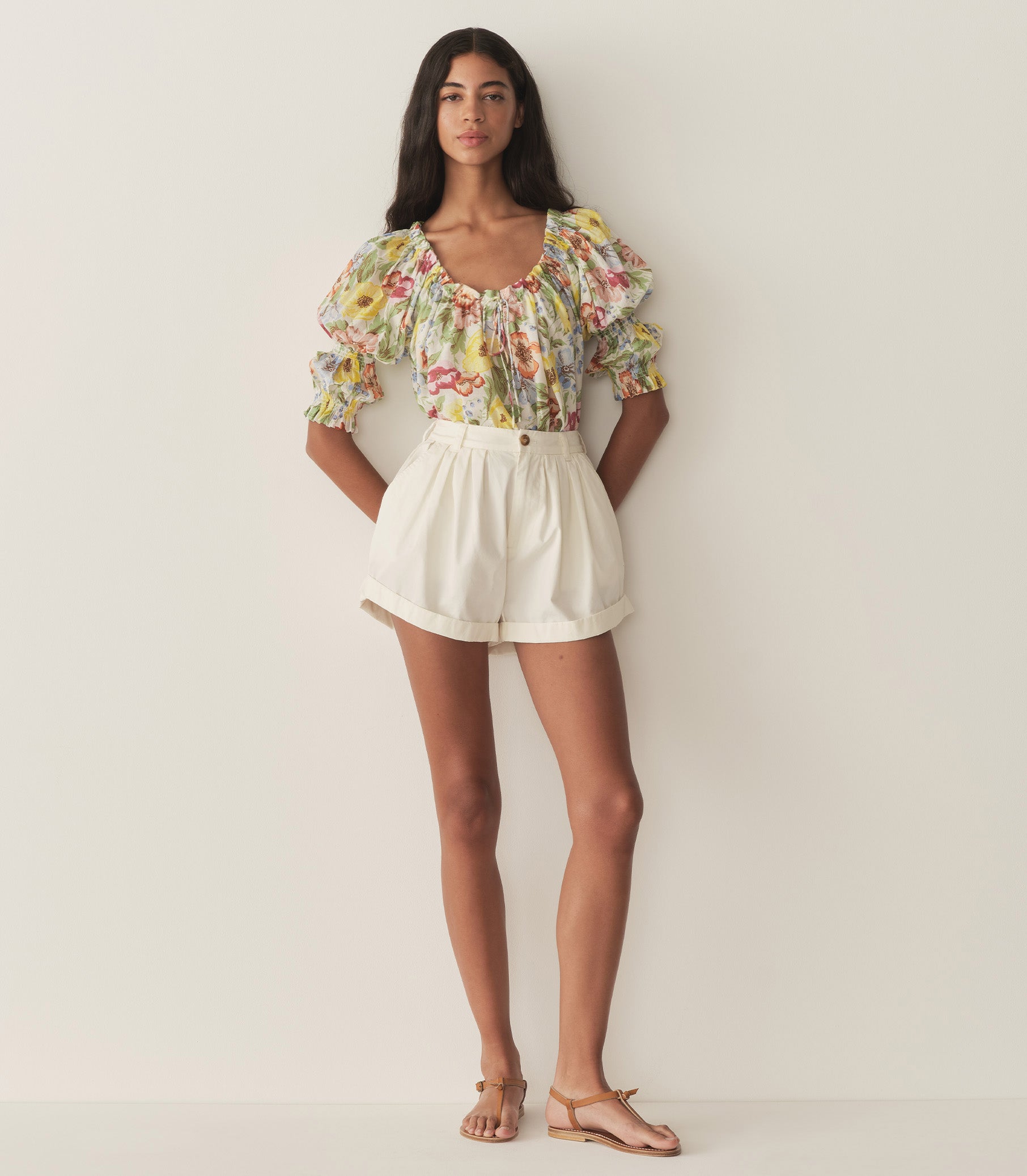 Crafted from the softest organic cotton voile and adorned with our colorful Anemone Bloom, the Inez Top debuts for Spring. Taking cues from our beloved Ischia Dress, the Inez features a breezy silhouette, double-puffed sleeves and a scoop neckline adorned with petite ruffles and a functional center tie.