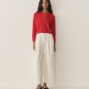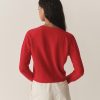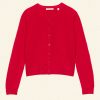 In the softest cashmere, the Claudine Cardigan features a crew neck, a fitted silhouette, full-length sleeves, and ribbing at the neckline, sleeve cuffs, and hem. A line of mother-of-pearl buttons extends down the front.