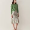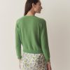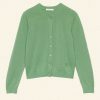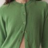 In the softest cashmere, the Claudine Cardigan features a crew neck, a fitted silhouette, full-length sleeves, and ribbing at the neckline, sleeve cuffs, and hem. A line of mother-of-pearl buttons extends down the front.