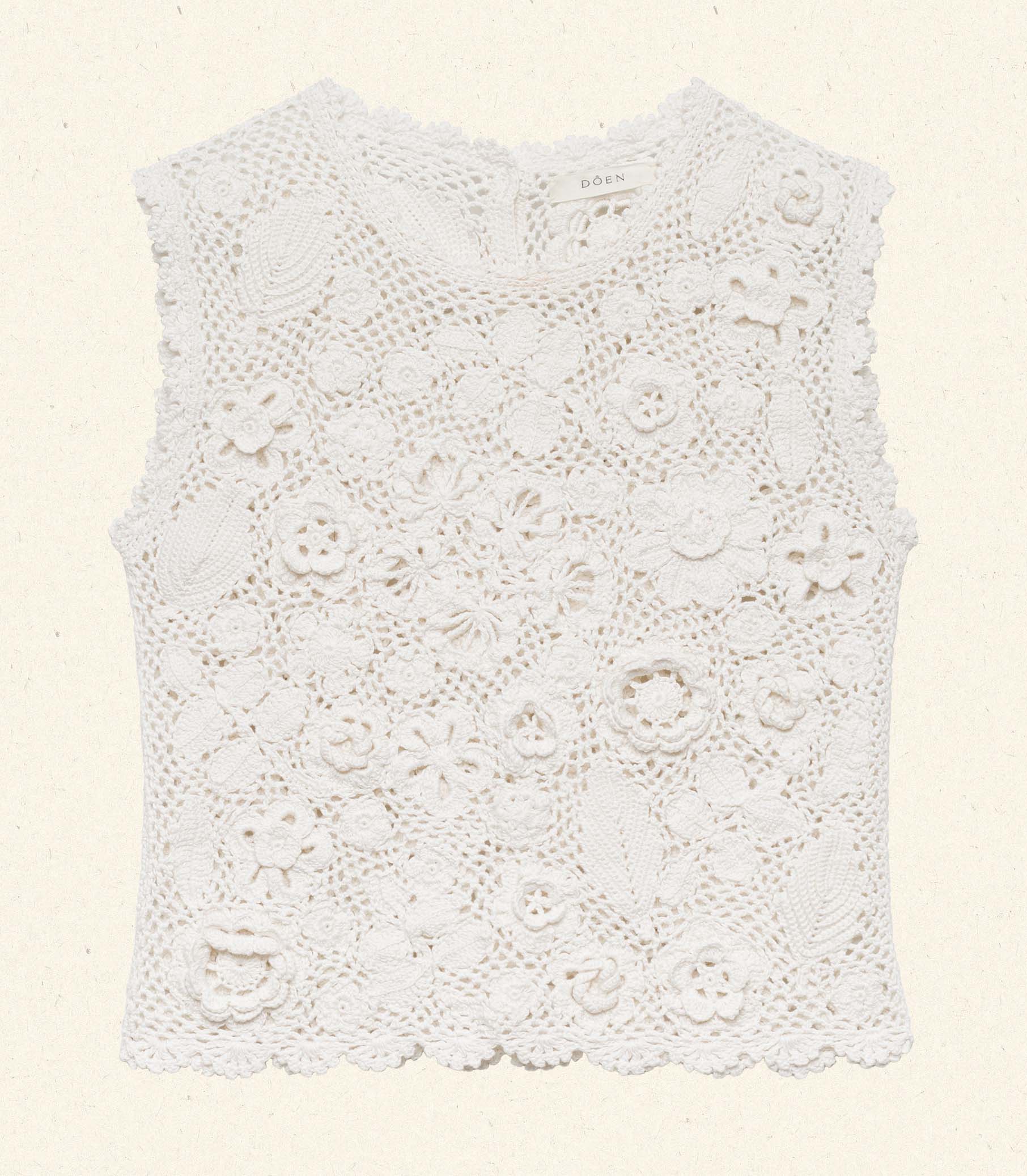 Made entirely by hand, the DÔEN Heirloom Marcia Top draws inspiration from our beloved Annalisa Dress. A true labor of love, the Marcia is a sleeveless style with a fitted silhouette. It features scallop crochet trim at the crew neckline, sleeve openings, and hem. Three hand-crocheted buttons extend down the back.nnCrafted from 100% mercerized Pima cotton, each top is skillfully hand-crocheted by our artisans in Peru, with each one taking several days to complete. Groups of knitters hand-crochet each flower before they’re meticulously hand-sewn onto the body of the top, in total passing through the hands of at least 15 different craftswomen before the piece is complete. Because each top is handmade, no two are exactly alike.
