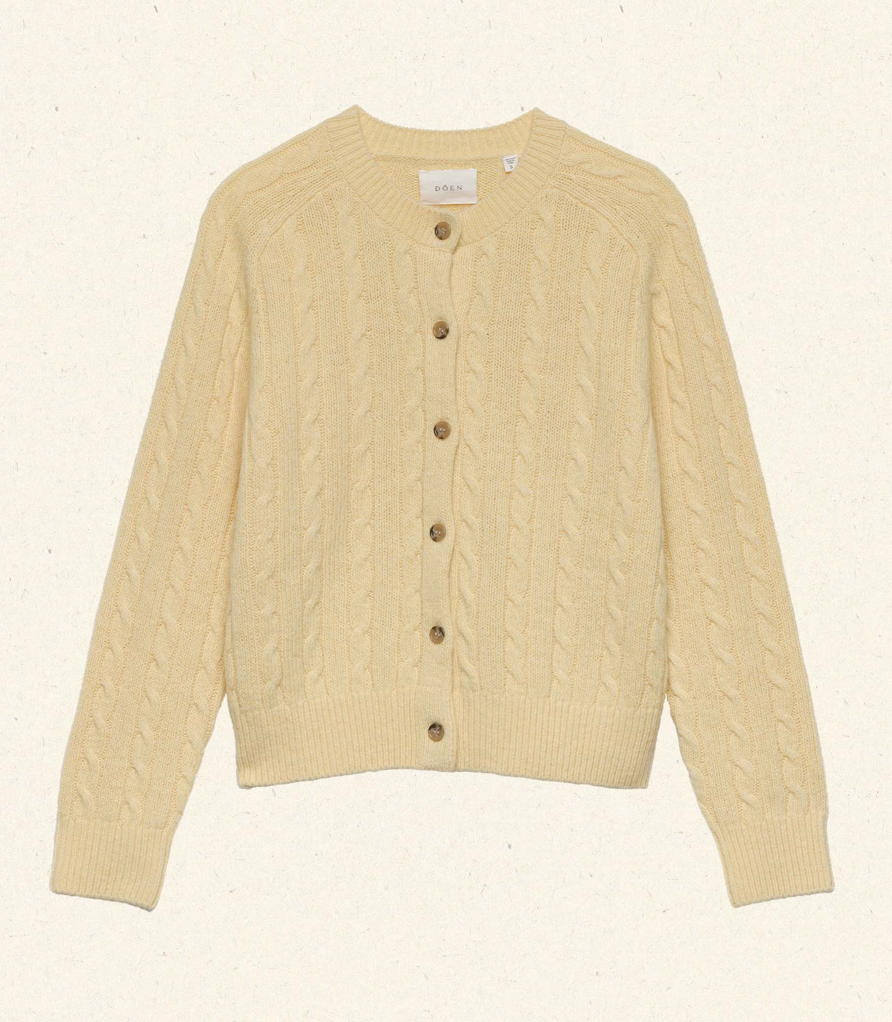 In a midweight cotton-wool blend, the Penrose Cardigan—a favorite of our co-founder, Katherine—is a ‘90s-inspired knit with a classic crew neck, fitted raglan sleeves, and ribbing at the neckline, cuffs, and hem. It features an allover cable design and faux horn buttons.