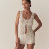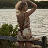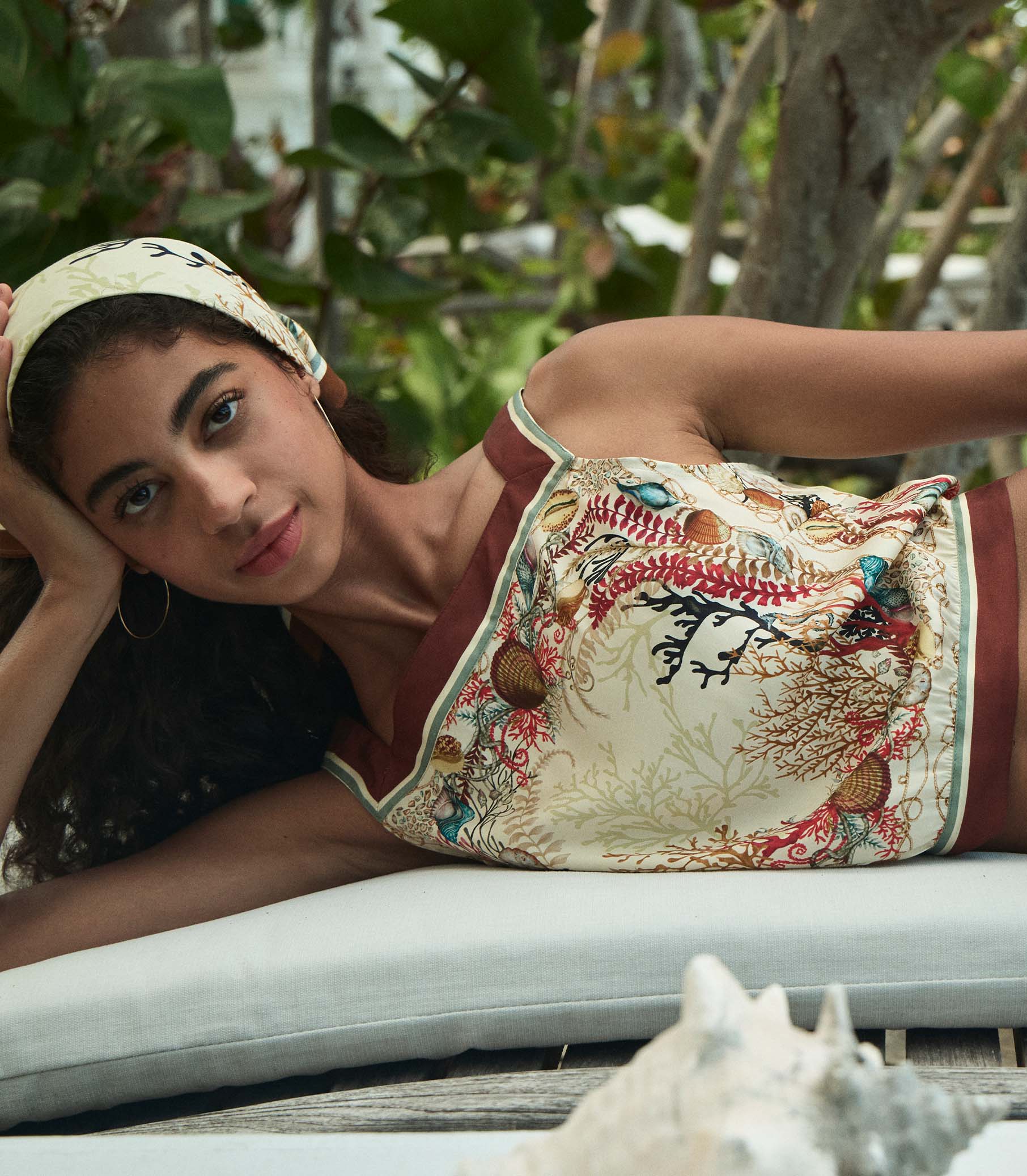 The DÔEN Heirloom Nami Top is a sleeveless open-back silhouette in buttery silk-viscose twill, graced with our hand-drawn Coquillages des Biarritz—a coastal print with intertwining seashells, kelp and coral. Placed borders trim the neckline, hem, and trailing back ties.