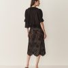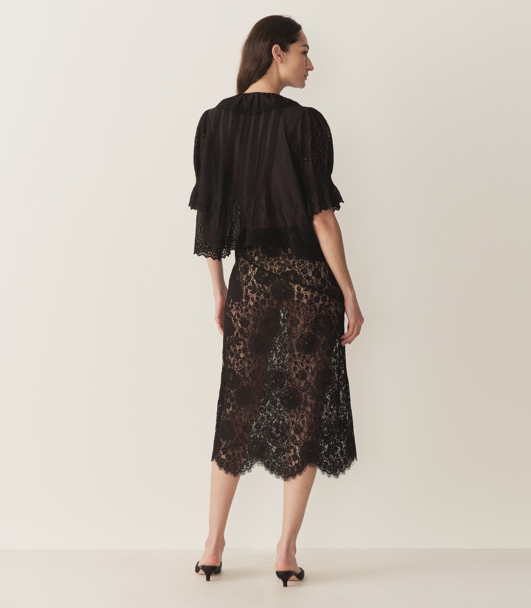 In an intricate allover lace, the Nandi Skirt—a favorite of our co-founders Margaret and Katherine—features ‘30s-inspired seam details, scalloped elastic at the waist, and an uneven hemline.