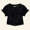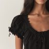 Crafted from 100% organic cotton poplin, the Nera Top features short puffed sleeves, a slightly cropped silhouette, mother-of-pearl buttons, and a scoop neckline with a grosgrain ribbon tie. Scallop eyelet detailing and ladder trim adorn the neckline, sleeve cuffs, and hemline, while a floral eyelet design extends down the front. For an antique-inspired finishing touch, an embroidered “D” at the bottom left hem nods to Victorian-era monograms.