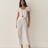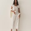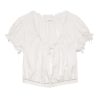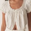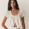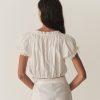 Crafted from 100% organic cotton poplin, the Nera Top features short puffed sleeves, a slightly cropped silhouette, mother-of-pearl buttons, and a scoop neckline with a grosgrain ribbon tie. Scallop eyelet detailing and ladder trim adorn the neckline, sleeve cuffs, and hemline, while a floral eyelet design extends down the front. For an antique-inspired finishing touch, an embroidered “D” at the bottom left hem nods to Victorian-era monograms.