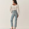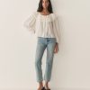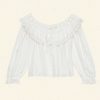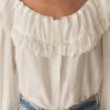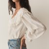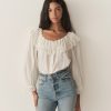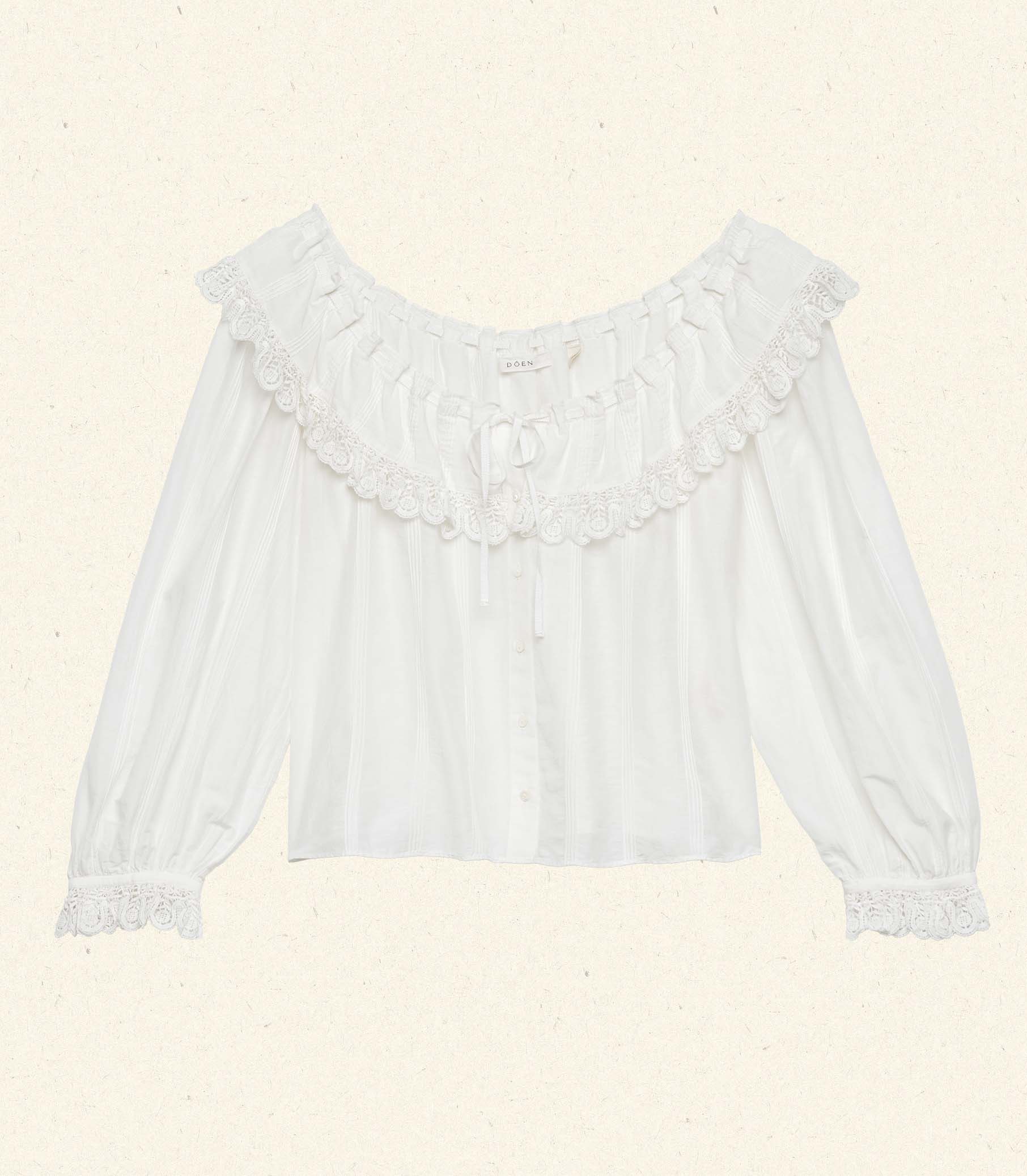 In a soft, lightweight cotton-silk blend, the Senette Top—a favorite of our co-founders, Margaret and Katherine—features a scoop neckline with a wide ruffled collar adorned with a grosgrain ribbon tie and hand-crocheted scallop lace trim. Allover clustered pintucks lend texture, while generous full-length sleeves finish in hand-crocheted scallop lace at the cuffs. Mother-of-pearl buttons extend down the front, and an embroidered “D” at the bottom left hem nods to Victorian era monograms.