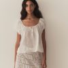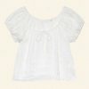 The Solina Top is crafted from lightweight ramie, featuring a breezy silhouette, short puffed sleeves, and a scoop neckline with an adjustable tie and playful keyhole detail.
