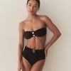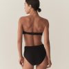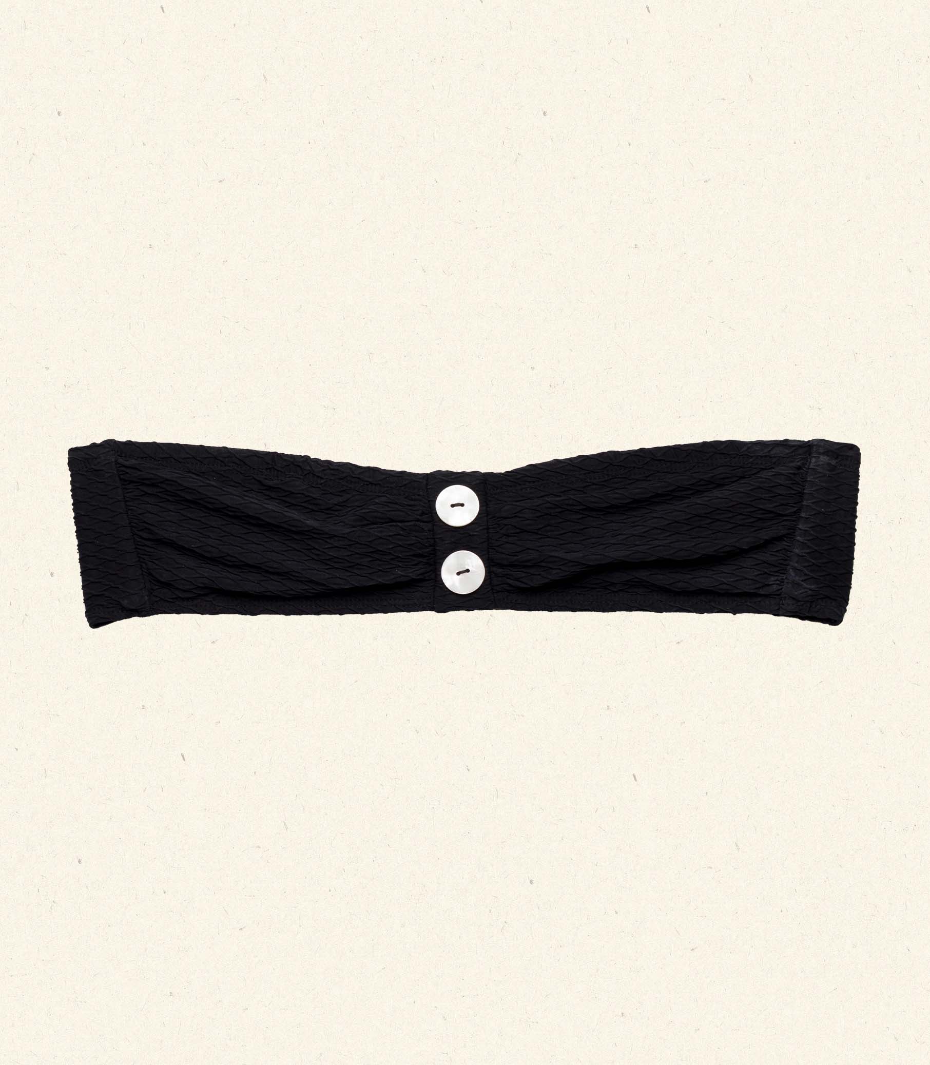 Inspired by 1960s swimwear, the Riva Bikini Top is a bandeau top crafted from a stretchy, honeycomb texture swim fabric and fully lined for comfort. A sweetheart neckline is accented with two oversized faux shell buttons, while zigzag stitching finishes the edges.