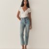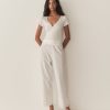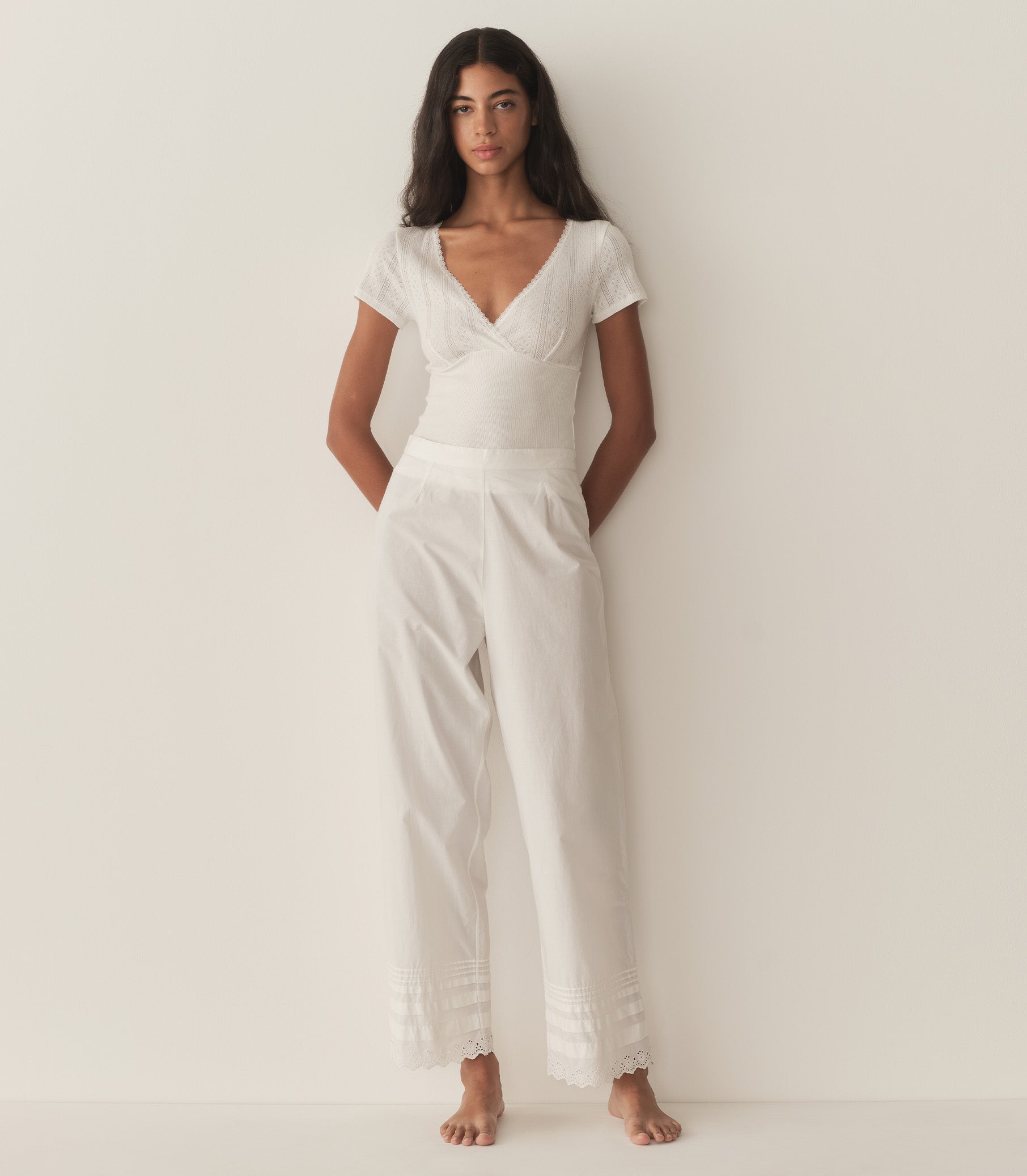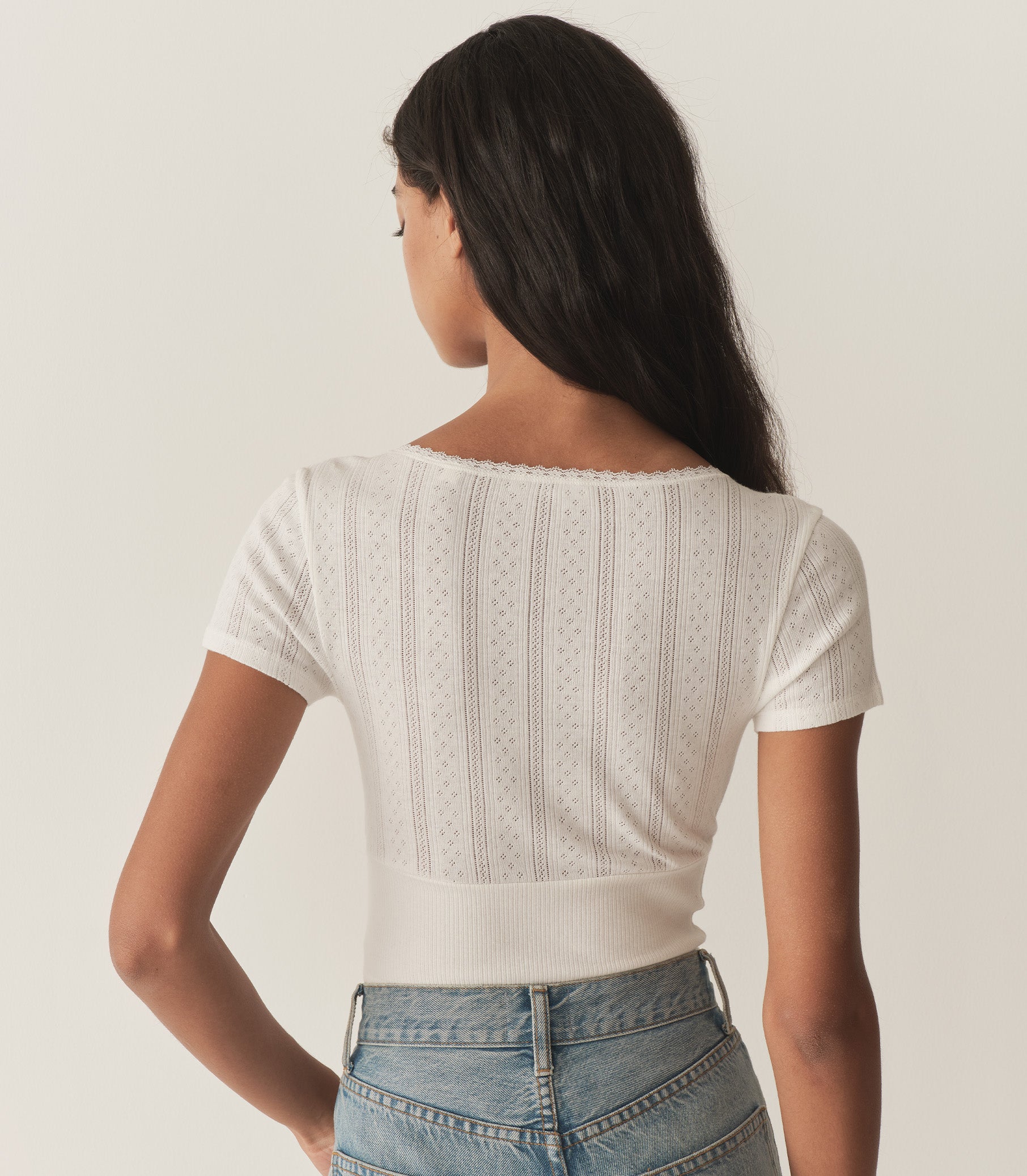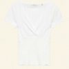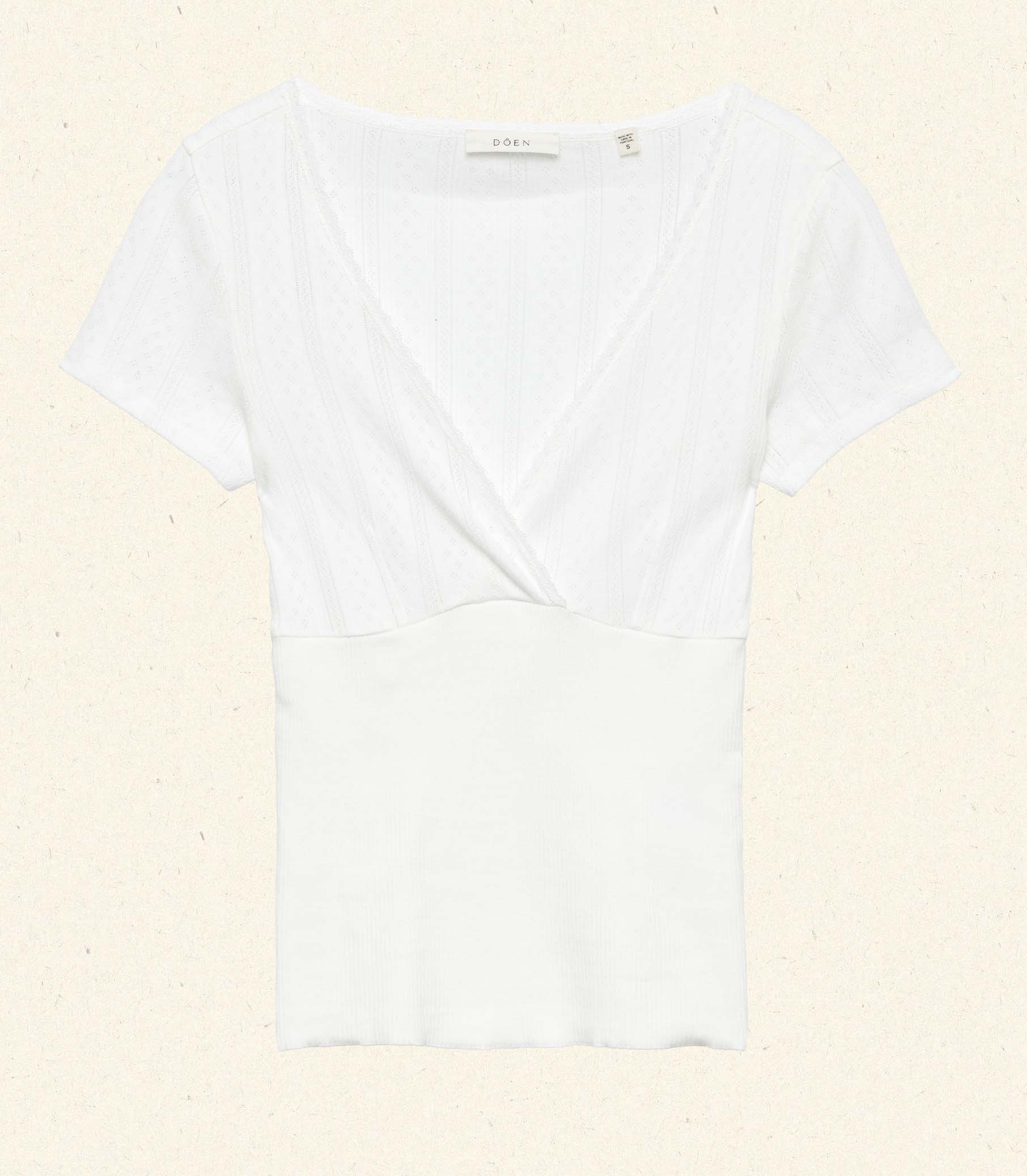 In the softest organic cotton, the Livia Tee features delicate pointelle at the bodice and sleeves, a close fit rib throughout the body, and a wrap V-neckline trimmed with delicate elastic lace.