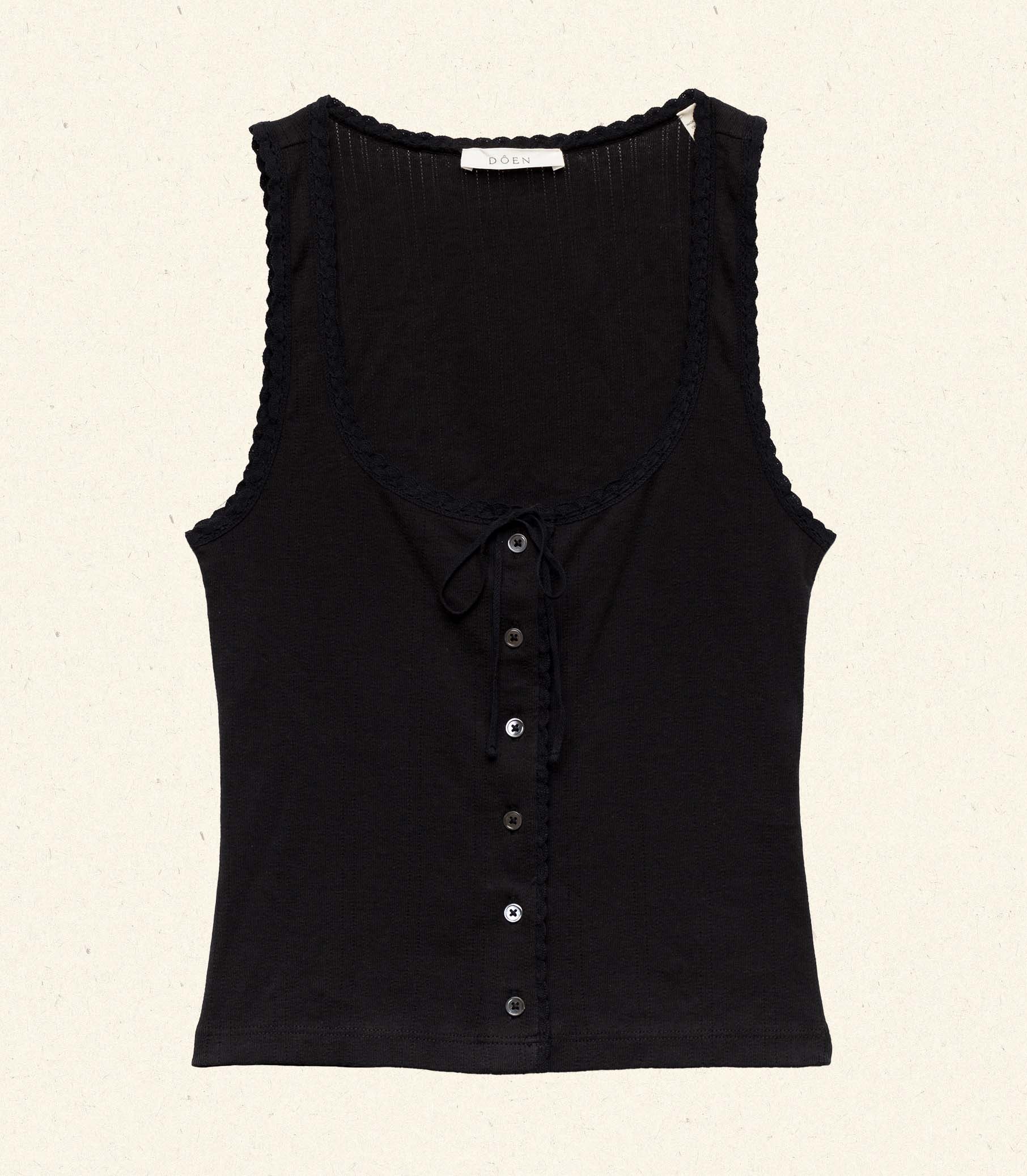 Crafted from the softest organic cotton pointelle, the Lois Tank features a fitted silhouette and a scoop neckline trimmed with delicate scallop detailing. Mother-of-pearl buttons run down the center front. Perfect for layering, the Lois is sure to become a year-round staple.