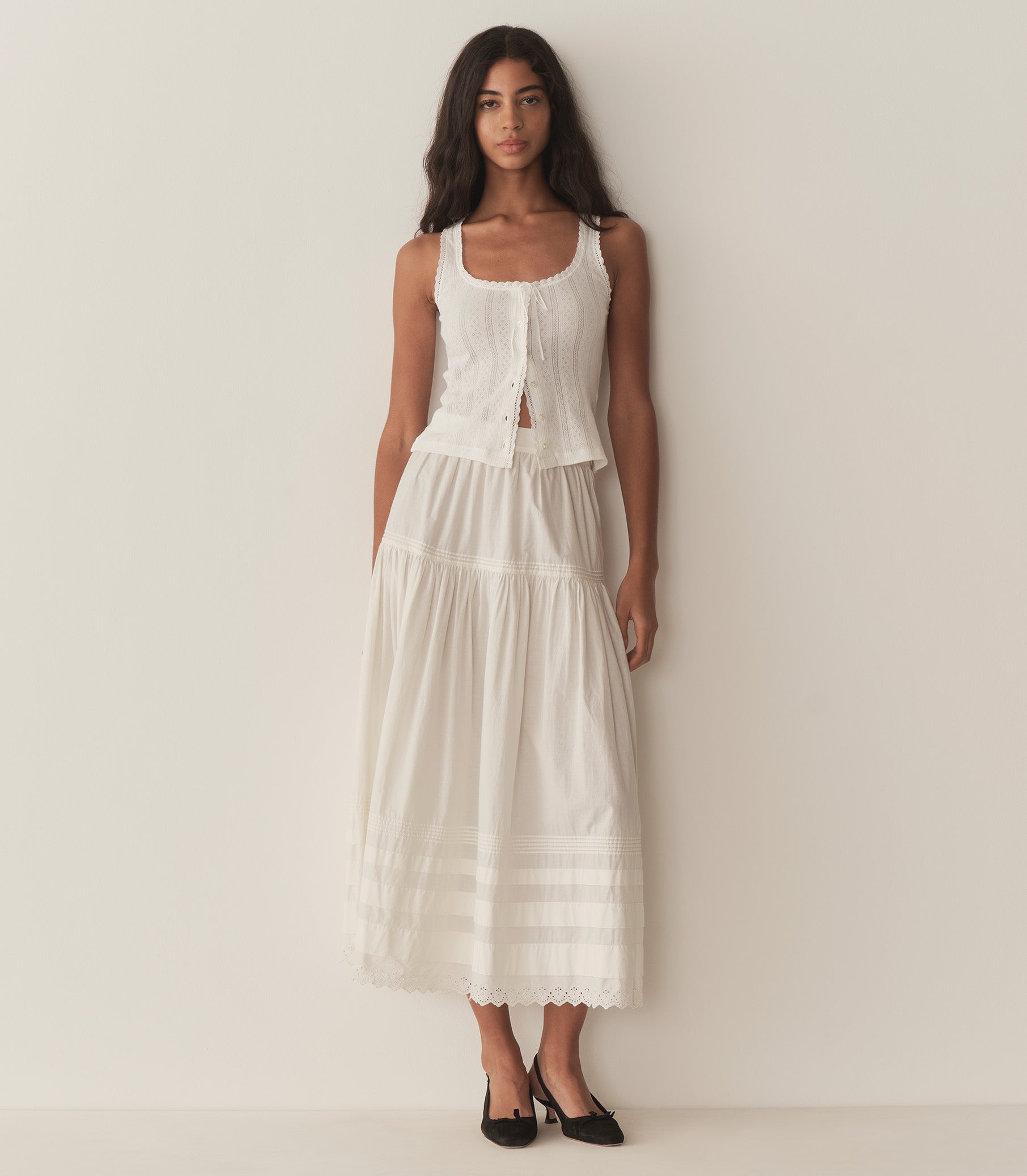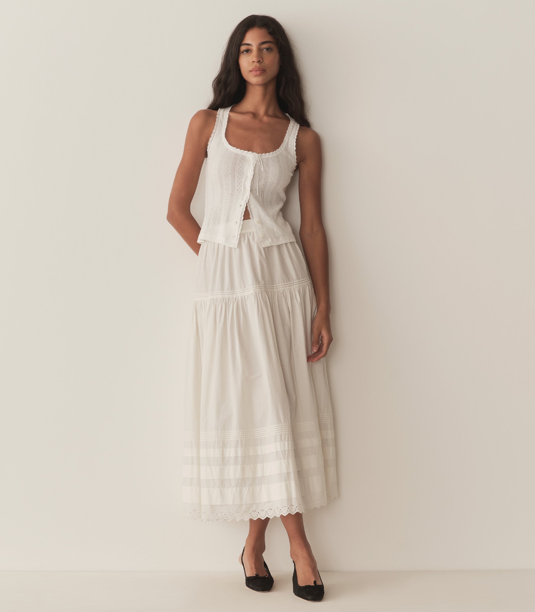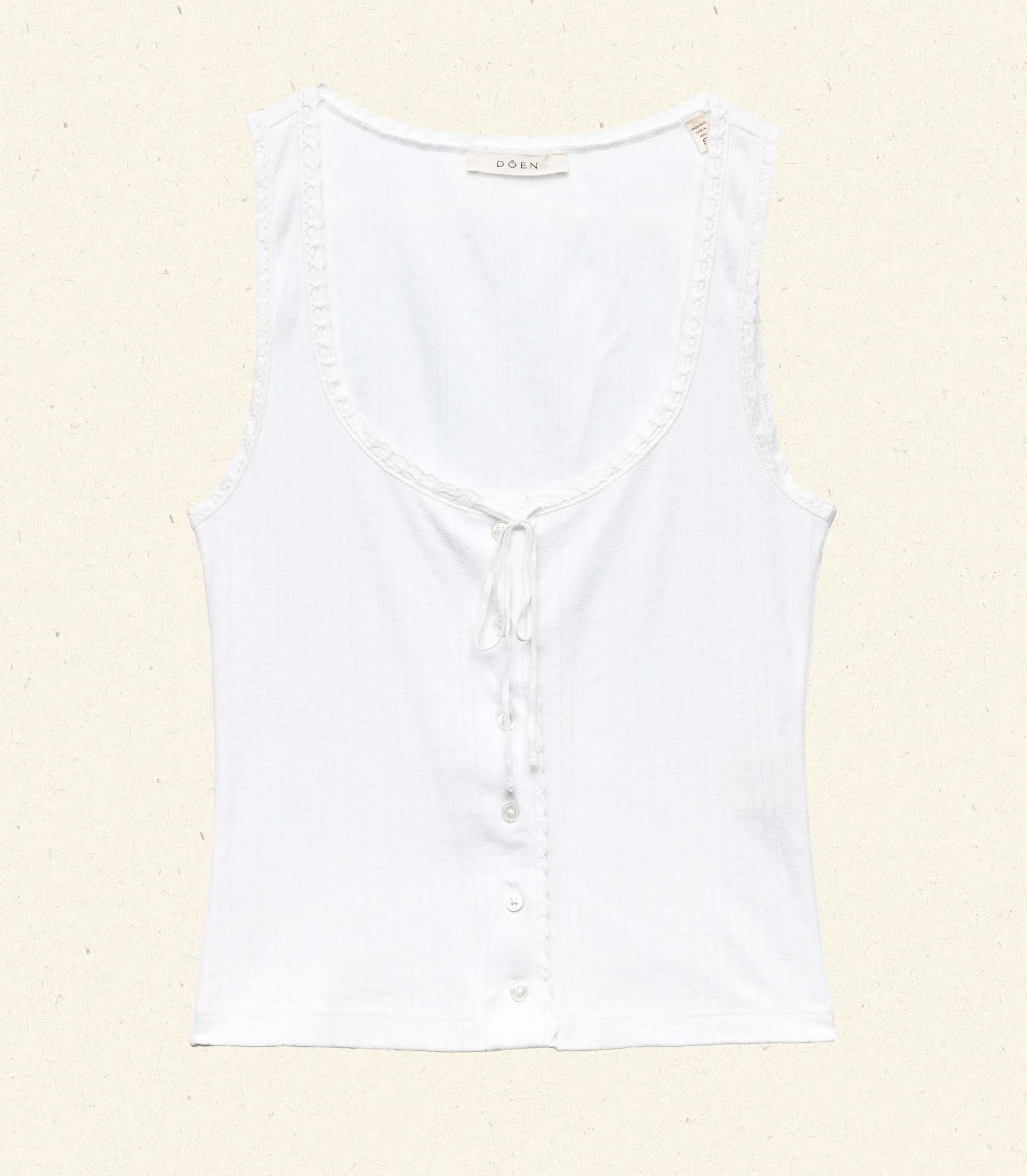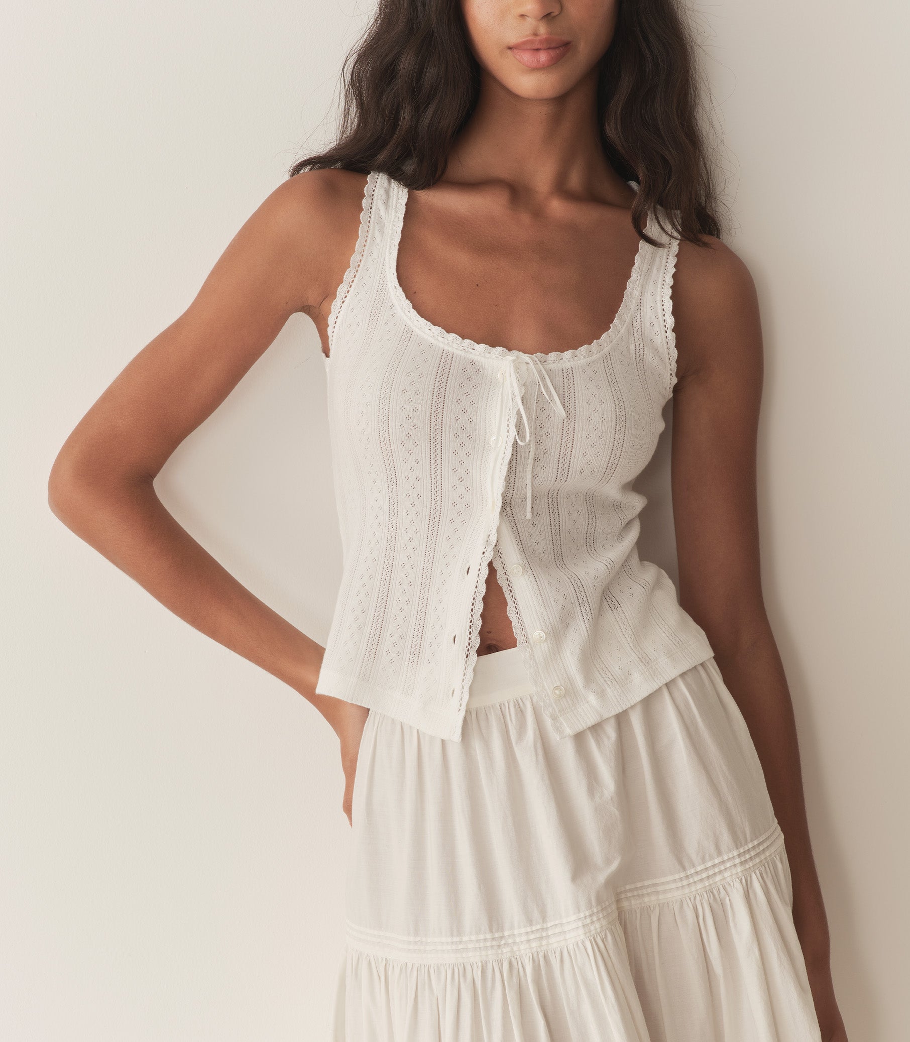 Crafted from the softest organic cotton pointelle, the Lois Tank features a fitted silhouette and a scoop neckline trimmed with delicate scallop detailing. Mother-of-pearl buttons run down the center front. Perfect for layering, the Lois is sure to become a year-round staple.
