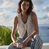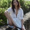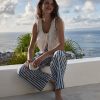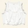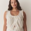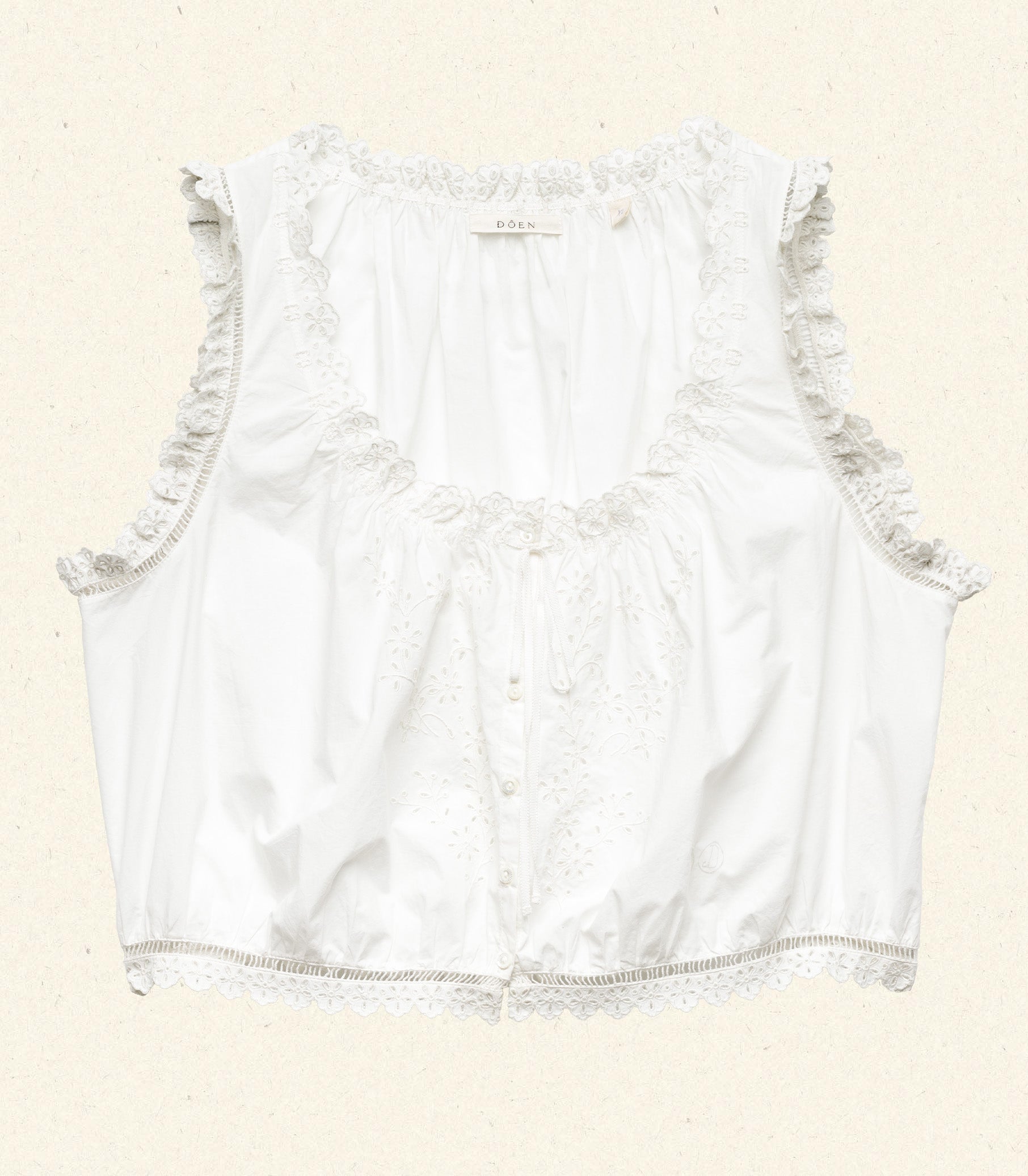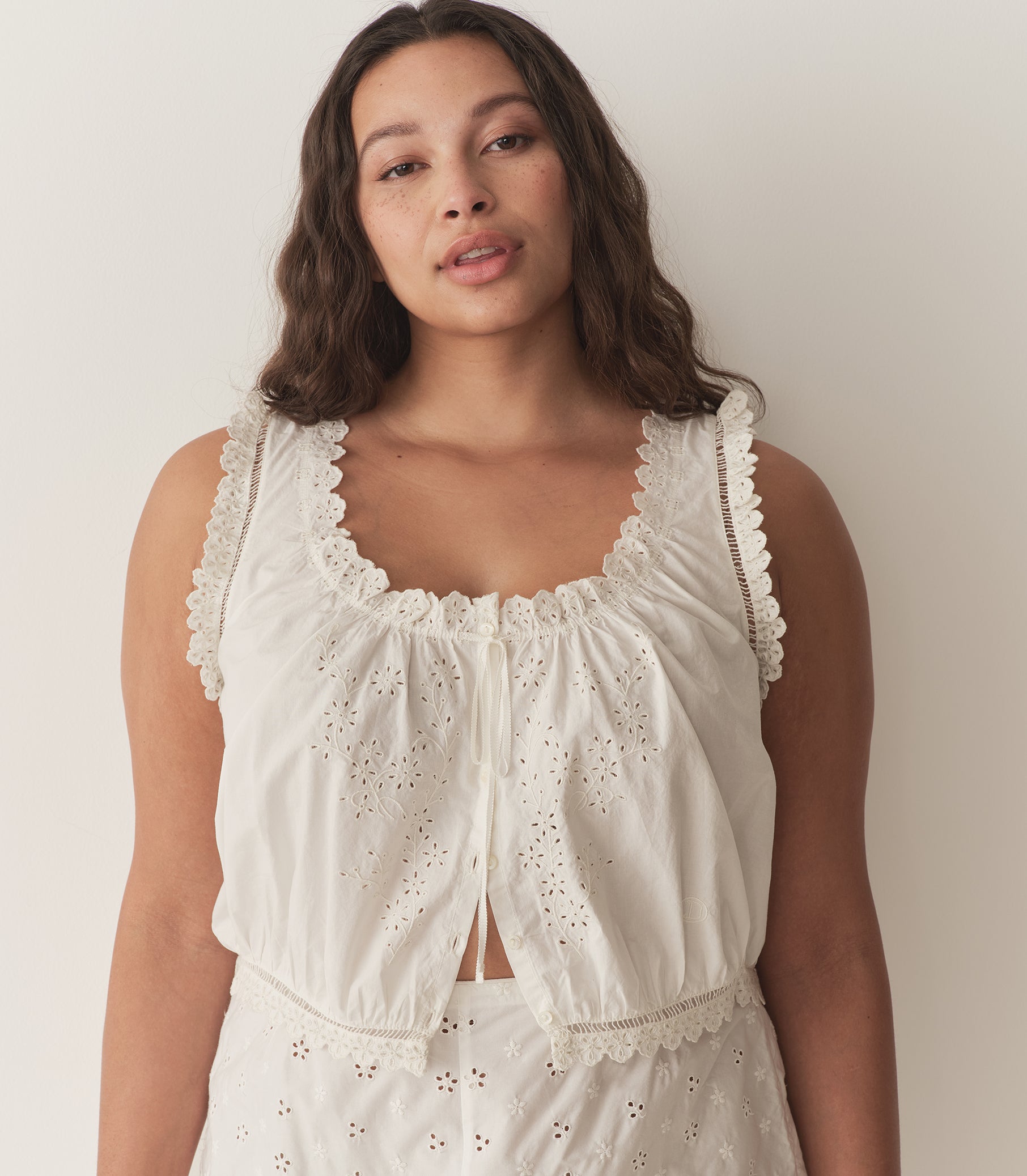 Crafted from 100% organic cotton poplin, our best-selling Traveler Top features a slightly cropped silhouette, mother-of-pearl buttons, and a scoop neckline with a grosgrain ribbon tie. Scallop eyelet detailing and ladder trim adorn the neckline, sleeve openings, and hemline, while a floral eyelet design extends down the front. For an antique-inspired finishing touch, an embroidered “D” at the bottom left hem nods to Victorian-era monograms.